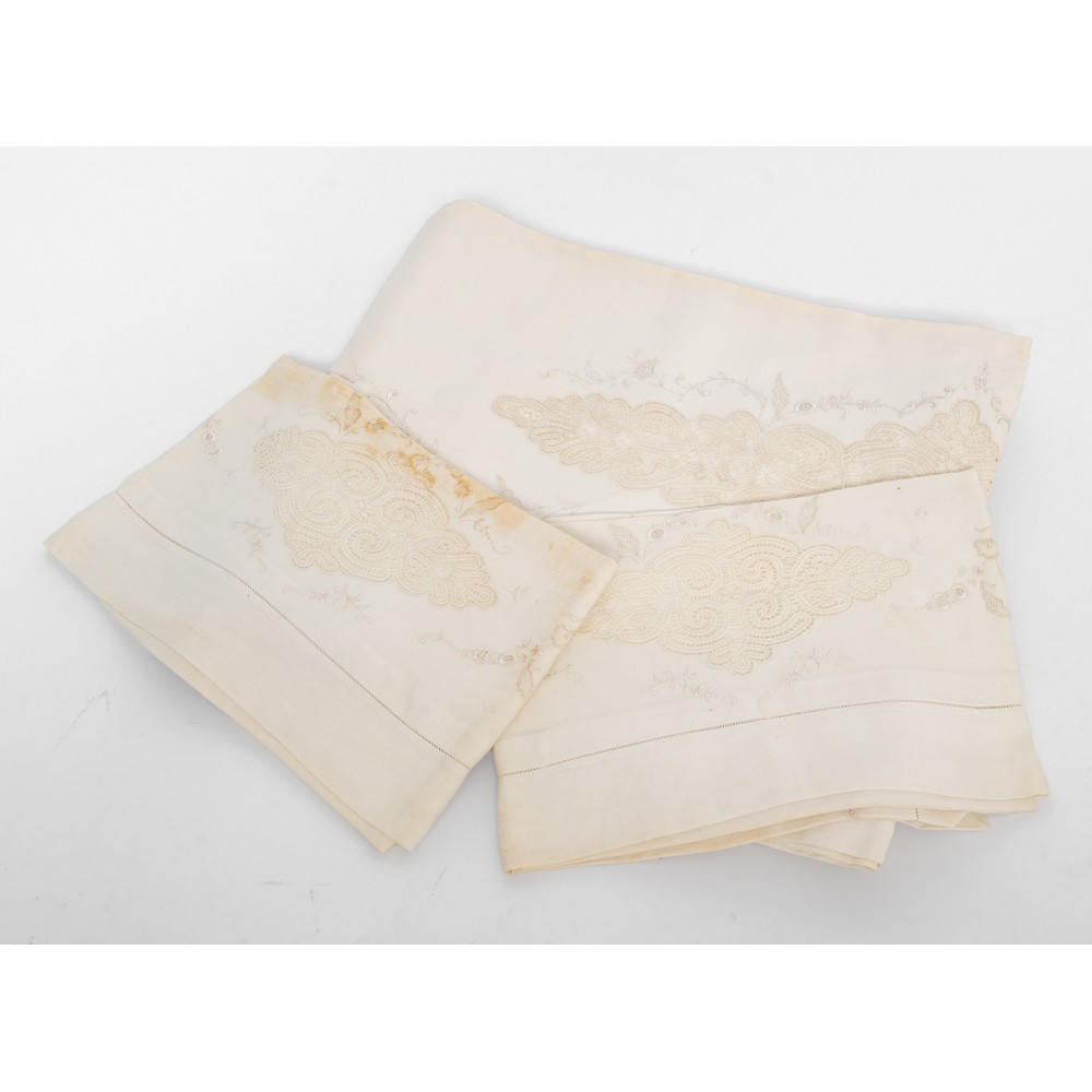 LENZUOLO matrimoniale con due federe in lino nei toni del bianco con ricami a mano (macchie).