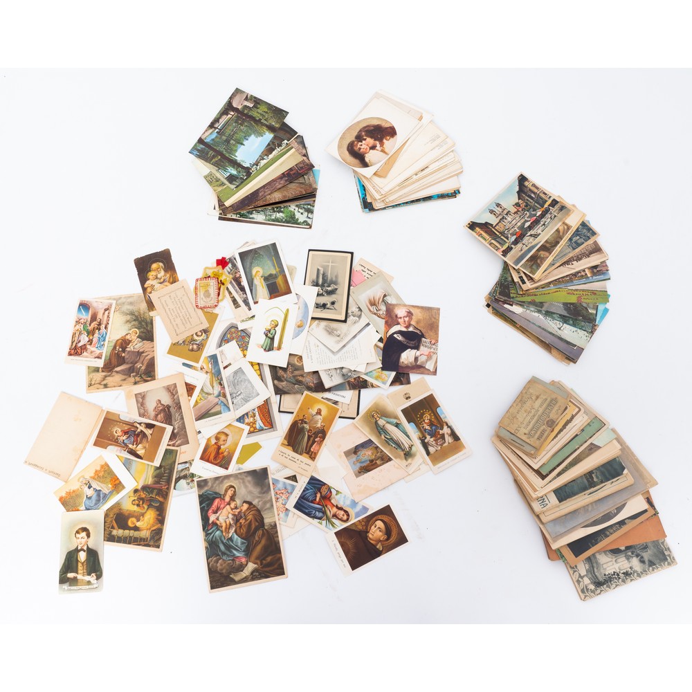 CARTOLINE VARIE, SANTINI, TESSERE E PICCOLE PUBBLICITA’ DATABILI TRA LA FINE DEL XIX SECOLO E LA PRIMA META’ DEL XX SECOLO. Parte delle cartoline risultano spedite e con affrancatura. Oltre 200 pezzi.