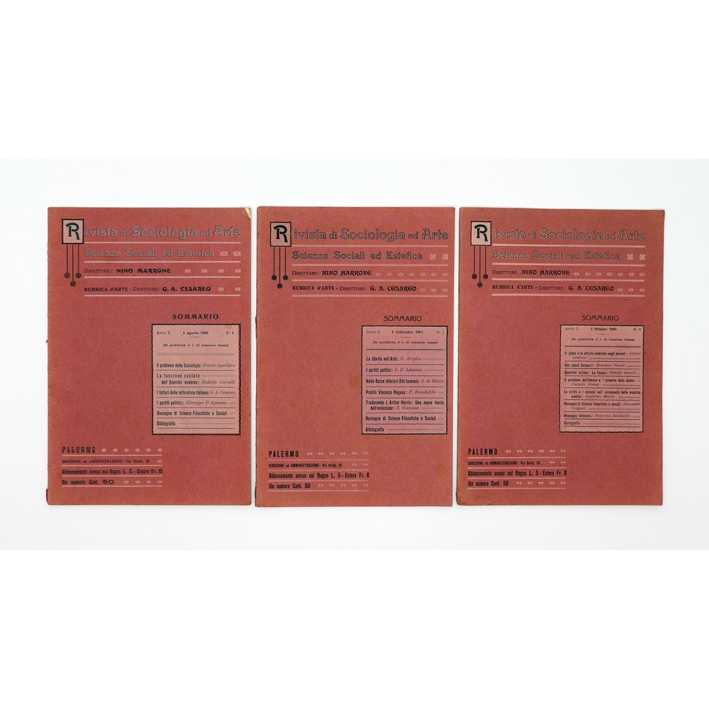 TRE NUMERI della RIVISTA DI SOCIALOGIA ED ARTE, SCIENZE SOCIALI ED ESTETICA, ed. Palermo 1908. Direttore Nino Marrone. Rubrica d’Arte Direttore G. A. Cesareo. In 8°. Brossure editoriali. In ottime condizioni. I numeri 4, 5 e 6 sono dei mesi di Agosto, Settembre ed Ottobre del 1908. Rari a trovarsi. Circa 35 pagine a rivista con pubblicità, in fine, di alberghi e stabilimenti siciliani ed italiani.
