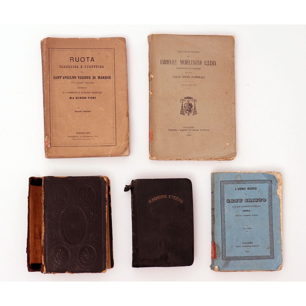 CINQUE VOLUMI DI ARGOMENTO RELIGIOSO: 1) Diego Tasi RUOTA SIMBOLICA E PROFETICA DI SANT’ANSELMO VESCOVO DI MARISCO, ed. Torino 1870, Tipografia Foa. In 8° piccolo. Brossura editoriale. Volume in discrete condizioni. Pp. 238. 2) Cardinale Michelangelo Celesia DISCORSI SACRI, ed. Palermo, Boccone del Povero 1890. In 8°. Brossura editoriale con tagli irregolari. Pagine ancora intonse. Volume in ottime condizioni. Pp. 285.3) Sac. Domenico Turano L’UOMO NUOVO IN GESU’ CRISTO, ed. Palermo, Stamperia Gaudiano 1857. In 16°. Brossura editoriale con tagli marginosi. Volume in ottime condizioni. Pp. 323.4) D. Giovanbattista Fenoglio LA VERA MADRE DI FAMIGLIA, ed. Milano, Giocondo Messaggi 1871. In 16°. Bella legatura in piena pelle rigida con impressioni a secco e titoli, fregi e figure in oro al dorso, che risulta slegato. Tagli marmorizzati. volume in buone condizioni. Pp. 520. 5) MASSIME ETERNE E CANTORINO LITURGICO, ed. Il Messaggero di S. Antonio, Padova 1947. In 24°. Legatura editoriale in piena tela rigida con titoli in oro al piatto e al dorso e impressioni a secco al piatto. Tagli colorati. Volume in discrete condizioni. Pp. 639.