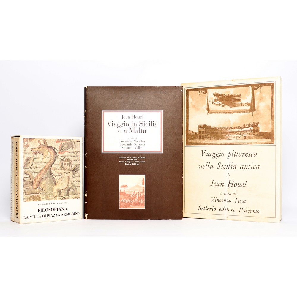 QUATTRO VOLUMI D’ARTE: Andrea Carandini / Andreina Ricci / Mariette De Vos FILOSOFIANA. LA VILLA DI PIAZZA ARMERINA, ed. S. F. Flaccovio, Palermo 1982. Un volume e un contenitore a schede sciolte in cofanetto. Due volumi in cofanetto editoriale rigido di Cm. 30 x 23. Volume di testo di pp. 414 con 232 illustrazioni in bianco e nero e a colori nel testo e 3 tavole fuori testo. Atlante, con 65 tavole sciolte a colori e in bianco e nero, più volte ripiegate, che illustrano le strutture, i pavimenti e le decorazioni parietali. 2) Jean-Pierre Louis Laurent HOUEL VIAGGIO IN SICILIA E A MALTA, Palermo; Napoli: Edizione per il Banco di Sicilia realizzata da "Storia di Napoli e della Sicilia" Società Editrice, 1977. In formato atlantico. A cura di Giovanni Macchia, Leonardo Sciascia, Georges Vallet. Con testi scelti tratti dal Voyage di Jean Houel. Trad. M. F. Buonaiuto, A. De Somma. Con sovracoperta originale con normali usure d’uso. Interno e legatura in perfetto stato di conservazione. Pp. XXX, 363, 108 tavole. 3) VIAGGIO PITTORESCO NELLA SICILIA ANTICA DI JEAN HOUEL, A CURA DI VINCENZO TUSA, ed. Sellerio, Palermo 1974. Formato in folio. Cartella editoriale contenente 16 stampe tratte dal “Voyage Pittoresque des Isles de Sicile, de Malte et de Lipari” del 1782 – 1787. In buone condizioni.