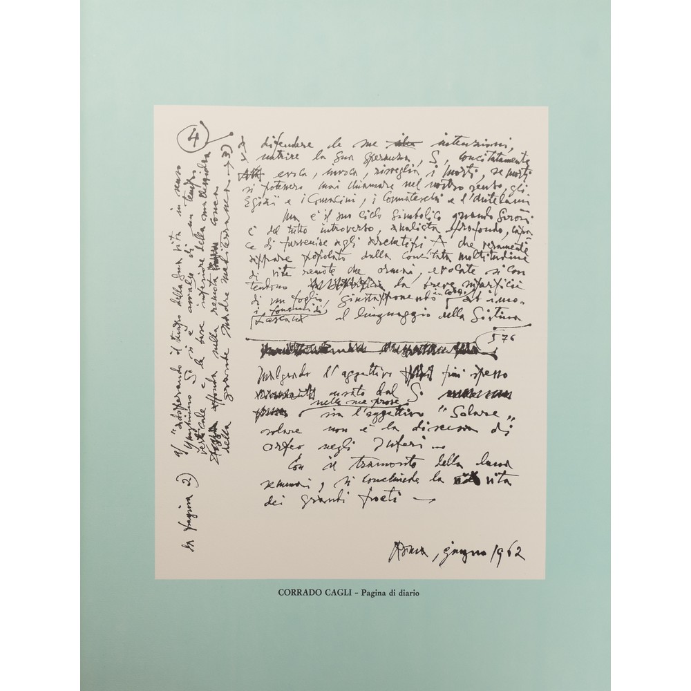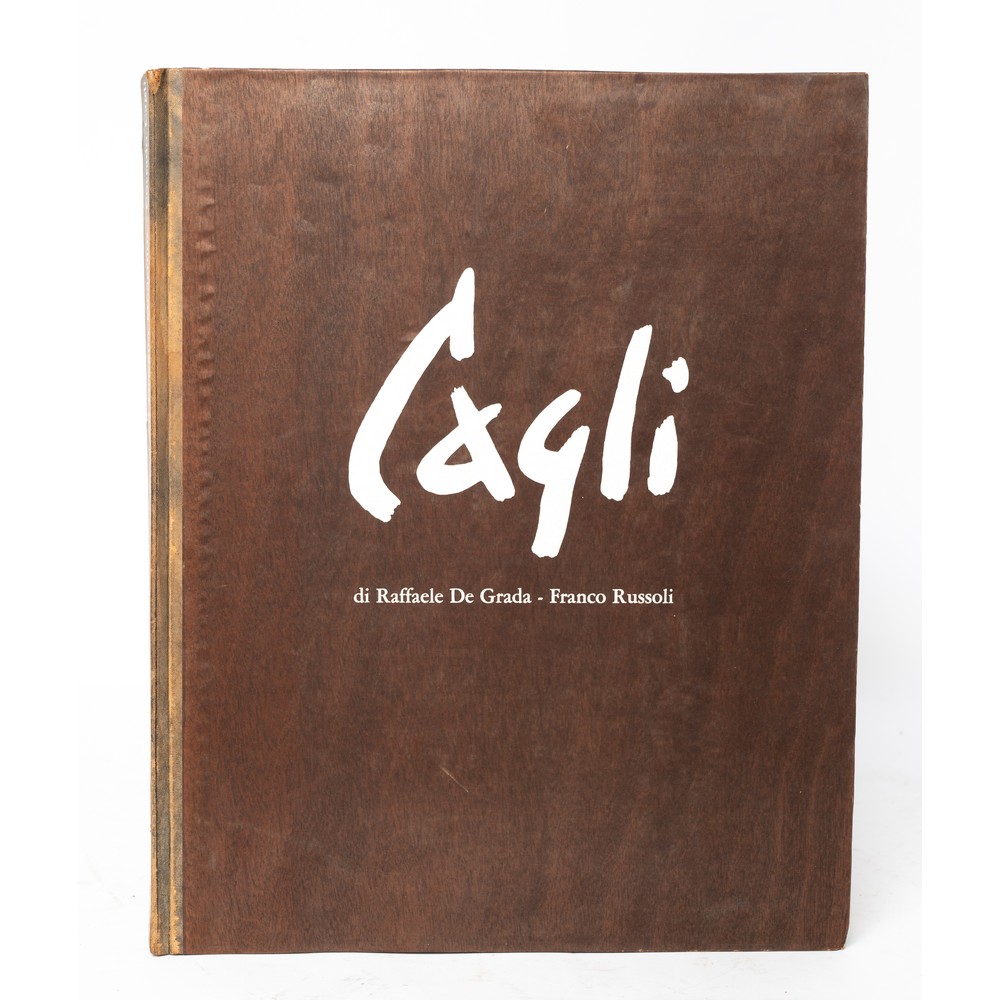 Raffaele De Grada / Franco Russoli CAGLI, ed. Milano, SEDA - Società Editrice per la Divulgazione dell'Arte 1964; legatura in mezza pelle con piatti lignei. In folio. In antiporta fotografia di Corrado Cagli realizzata da Carlo Pizzigoni. Nell'opera appaiono opere inedite facenti parte di collezioni private. L'artista ha collaborato alla realizzazione di quest'opera arricchita con alcuni esemplari di tavole originali, a firma autografa. Di quest'opera sono stati tirati 150 esemplari ad personam con numerazione romana da I a CL; n. 450 esemplari segnati con numeri romani da CLI a DC e infine 35 esemplari speciali riservati all'editore. In nostro esemplare è il n. numero CDLXXXVI. Pp. 188, con 35 tavole a piena pagina in applicazione e coperte da velina. Fotografia dell’autore in antiporta. Esemplare in ottime condizioni.