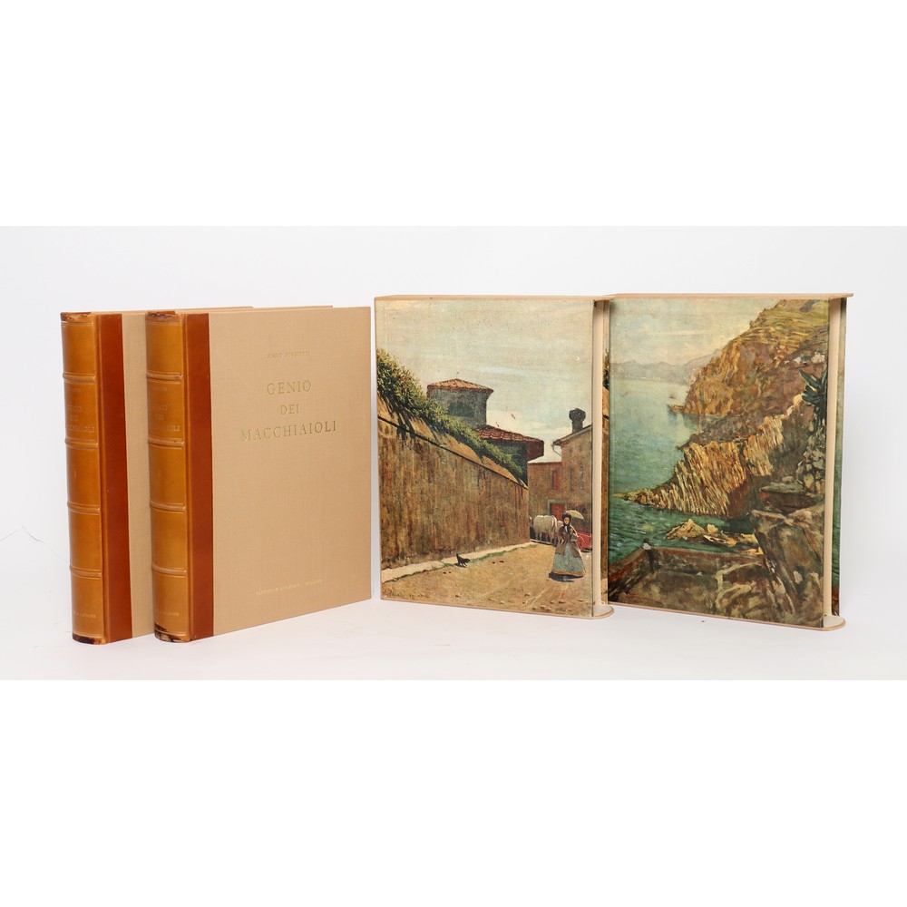 DUE VOLUMI D’ARTE: Mario Borgiotti GENIO DEI MACCHIAIOLI, ed. Alfieri e Lacroix, Milano 1964. Due volumi in formato in 4° entro cofanetti cartonate editoriali in tela figurata a colori. legatura editoriale in mezza pelle, titolo e filetti in oro ai dorsi, titolo in oro sui piatti anteriori, sovraccoperta in acetato trasparente. Pp. 712, (6), in paginazione continua fra i due volumi. Con 340 illustrazioni a colori applicate sulle carte.