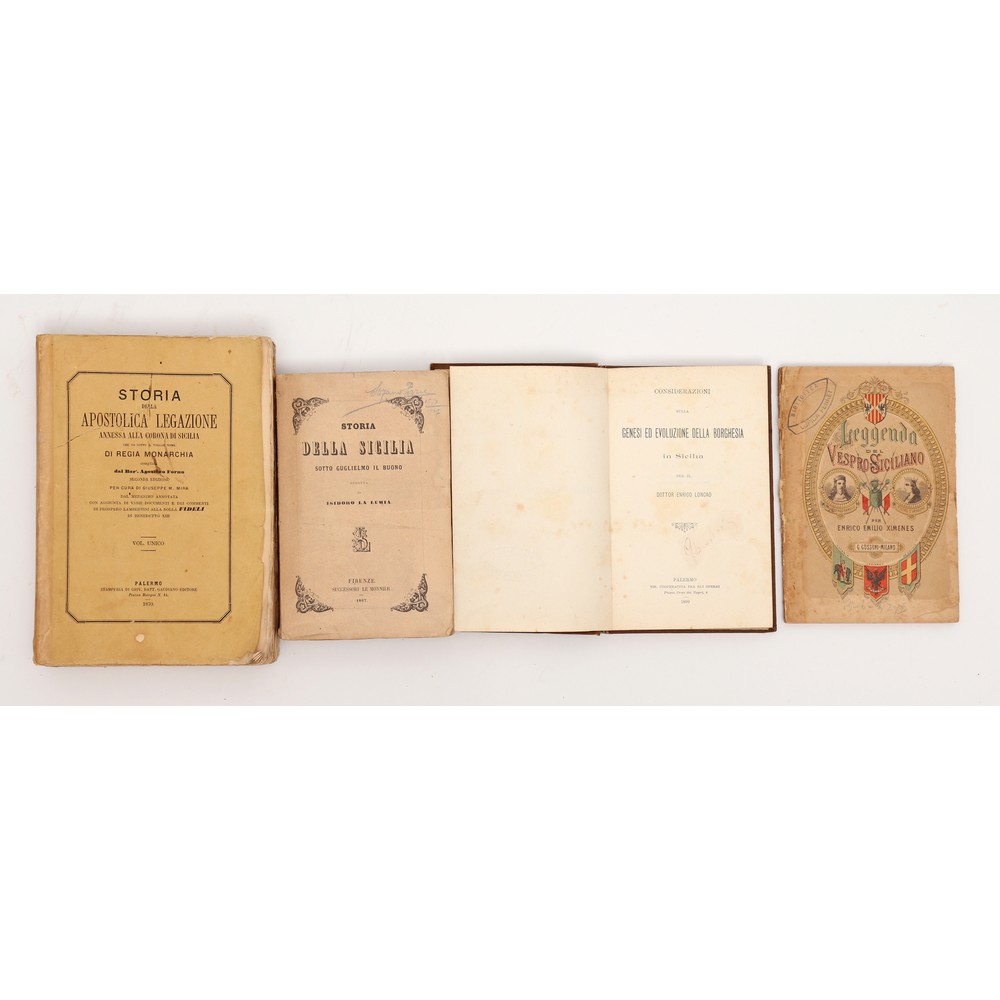 QUATTRO VOLUMI DI ARGOMENTO STORICO SULLA SICILIA: 1) Enrico Emilio Ximenes LEGGENDA DEL VESPRO SICILIANI, LEGGENDA STORICO – POPOLARE DEL XIII SECOLO, ed. Giovanni Gussoni, Milano 1882. In 16°. Bella brossura editoriale figurata a colori. Dorso slegato. Volume in buone condizioni. Pp. 48, (4). 2) Enrico Loncao CONSIDERAZIONI SULLA GENESI ED EVOLUZIONE DELLA BORGHESIA, ed. Palermo, Tipografia Cooperativa fra gli Operai, 1899. Legatura coeva in piena percallina rigida con titoli , filetti e iniziali di appartenenza in oro al dorso. volume in ottime condizioni. Molto raro. Pp. 214. 3) Isidoro La Lumia STORIA DELLA SICILIA SOTTO GUGLIELMO IL BUONO, Firenze, Successori Le Monnier 1867. In 8° piccolo. Brossura editoriale con tagli marginosi. Al cune fioriture e bruniture sparse. Volume in ottime condizioni. Pp. 401, (2). 4) Agostino Forno STORIA DELLA APOSTOLICA LEGAZIONE ANNESSA ALLA CORONA DI SICILIA, ed. Palermo, Giovan Battista Gaudiano 1870. Seconda edizione a cura di Giuseppe M. Mira. In 8°. Brossura editoriale con normali usure d’uso. pagine con sporadiche fioriture ma in ottime condizioni. Raro. pp. 433.