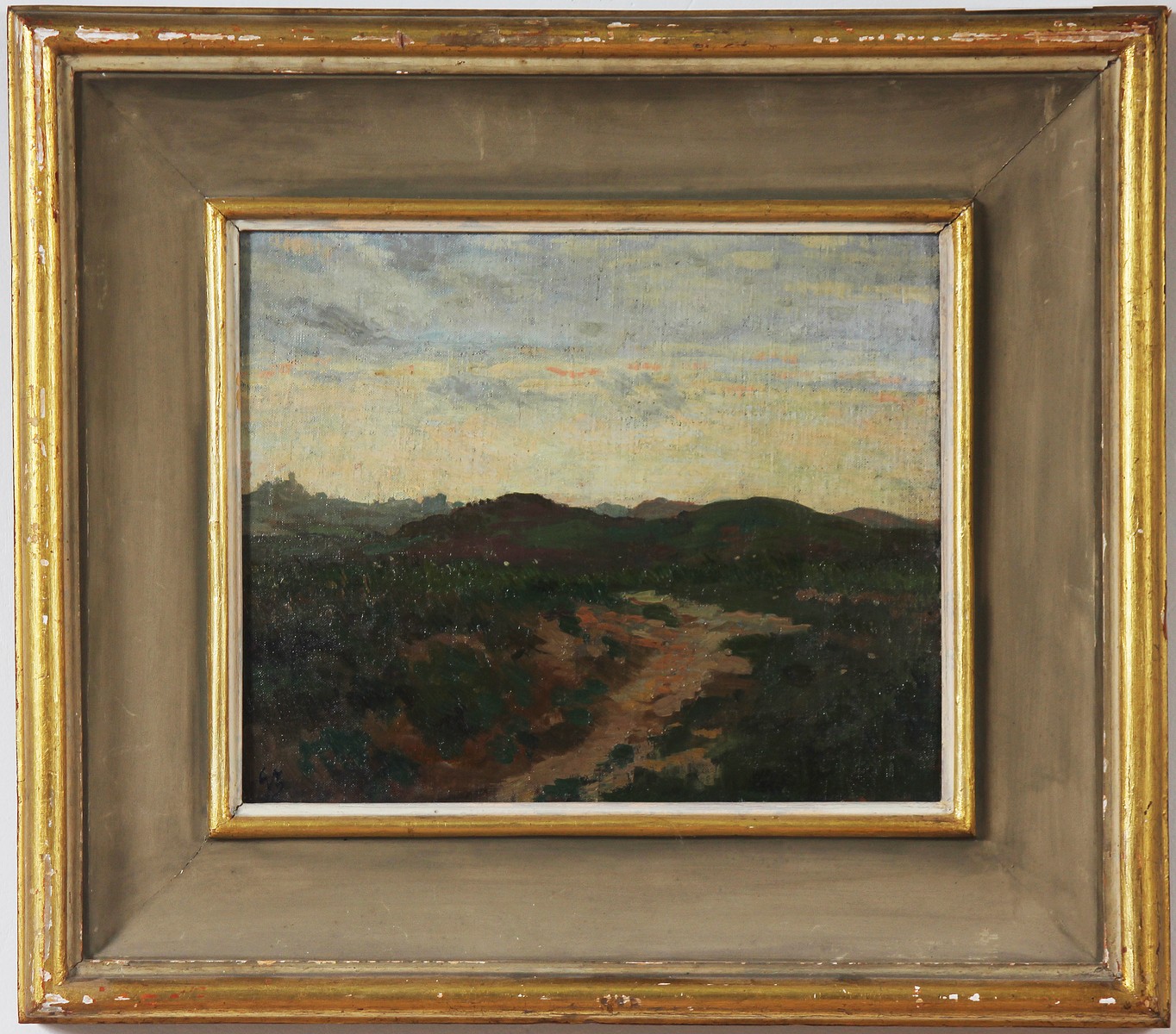 ZUCCARO GUIDO (1876 - 1944) Il castello di taviano dalle alture di Salvo. 1923. Olio su cartone telato. Cm 30,00 x 25,00. Firma in basso a sinistra. Al retro titolo, anno e cartiglio mostra galleria Salvetti, Milano. Cornice presente