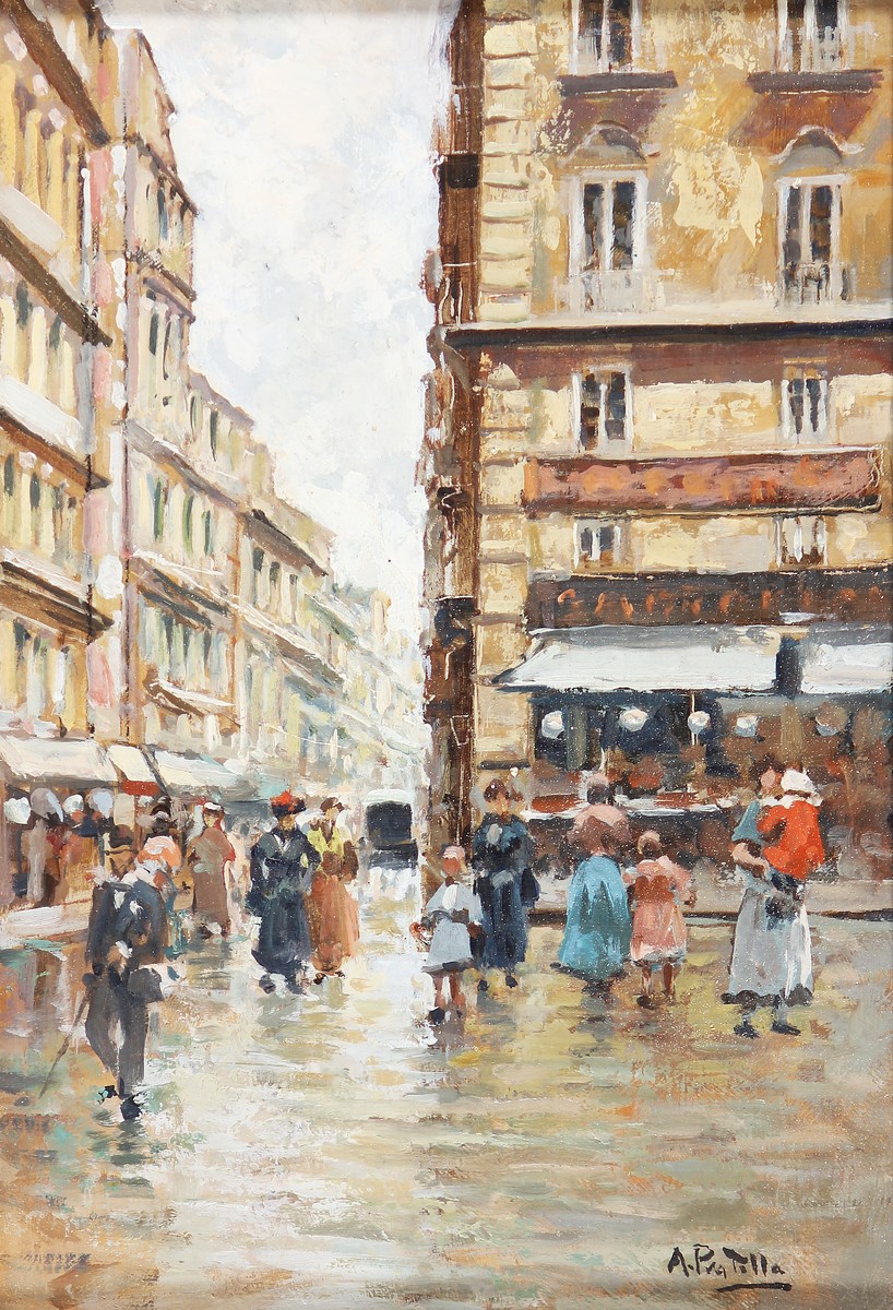 PRATELLA ATTILIO (1856 - 1949) Centro cittadino. Olio su tavola. Cm 13,00 x 20,00. Firma in basso a destra. Cornice presente