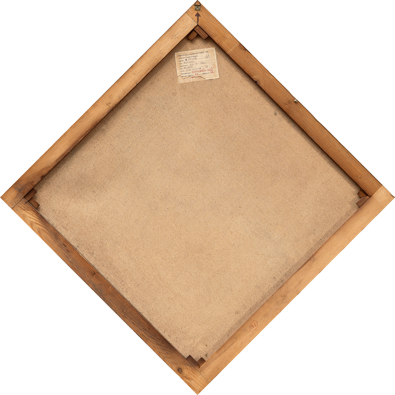 Cartiglio dell'esposizione 'I giovani alla Galleria San Fedele - 1969' con caratteristiche tecniche dell'opera al retro