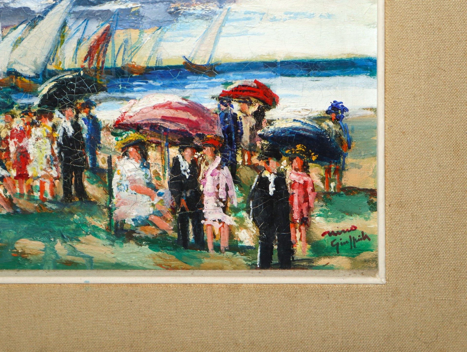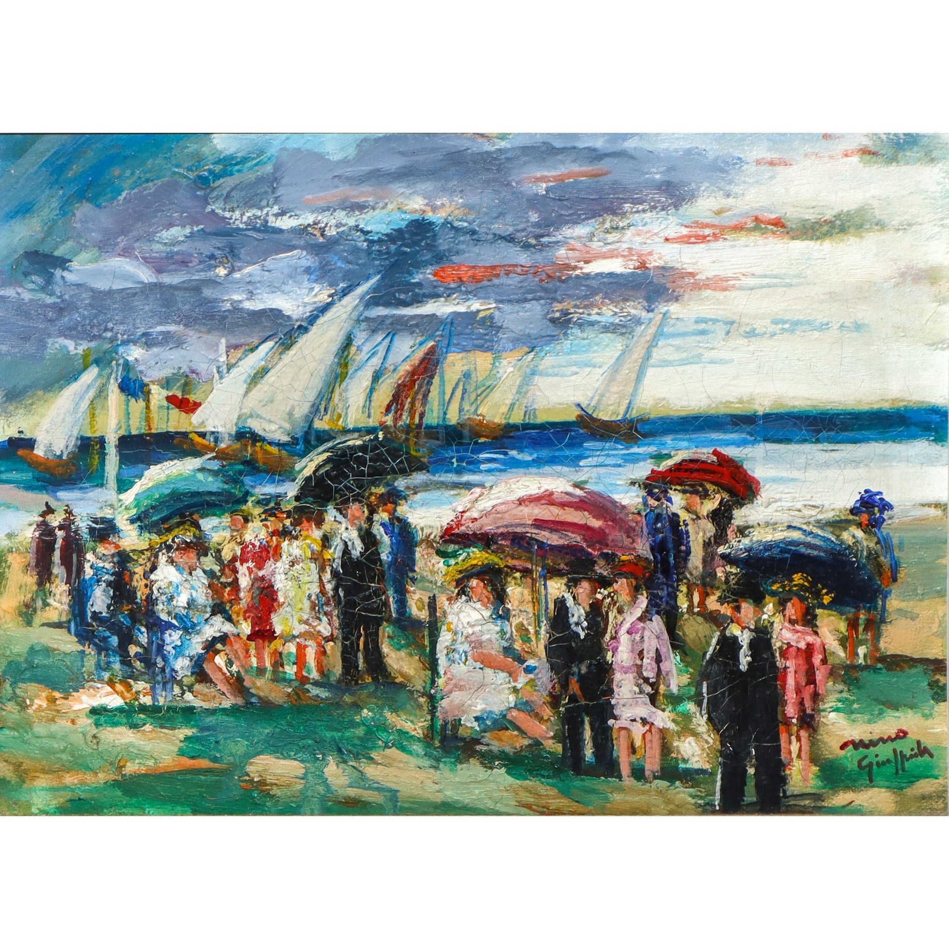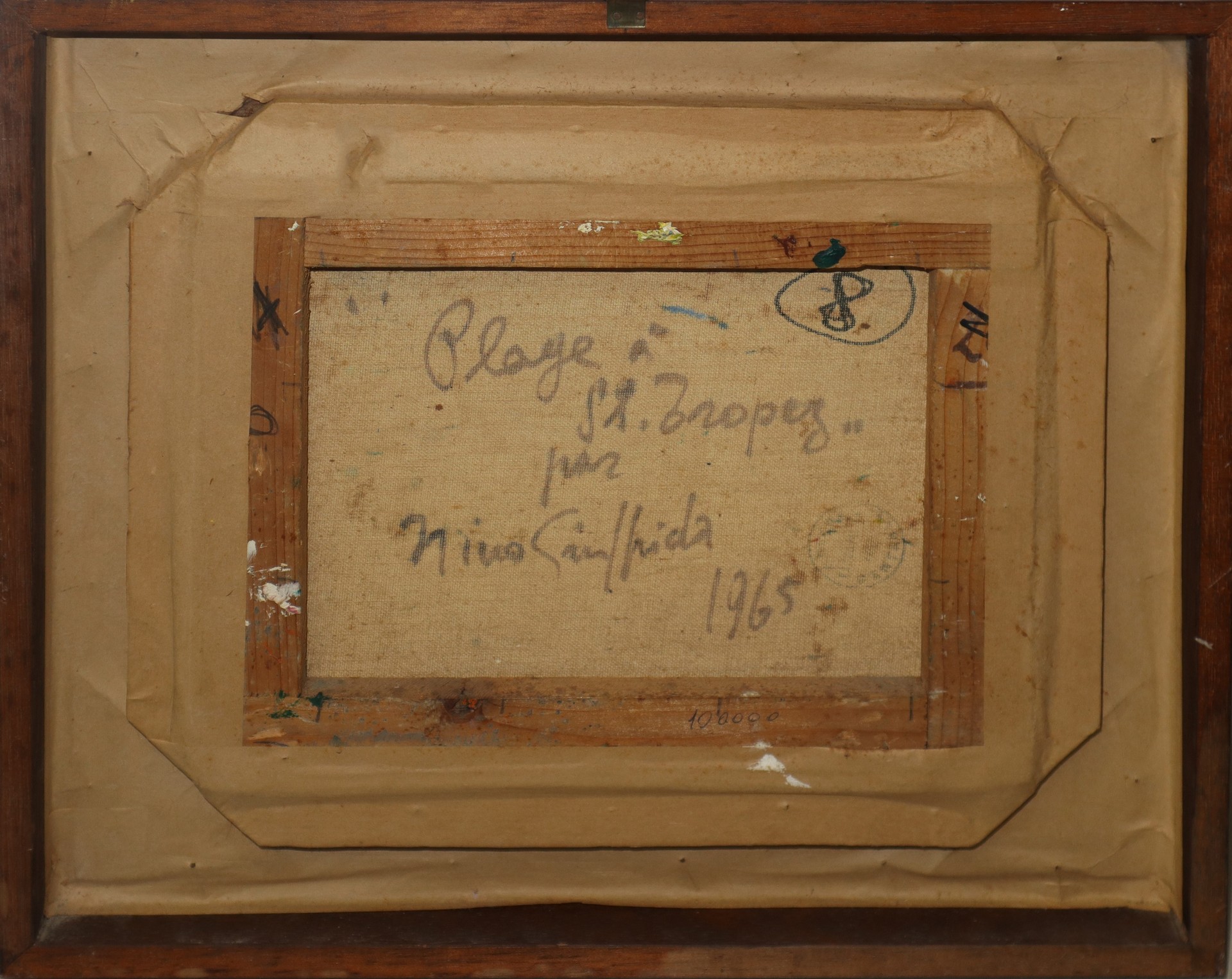 Antonio Giuffrida (Catania 1924 - Rosny-sous-Bois 2015) - Plage a St. Tropy, 1965 h cm 27X32 in cornice h cm 35x40 Olio su tela Firmato, datato e titolato al retro. Firmato in basso a destra