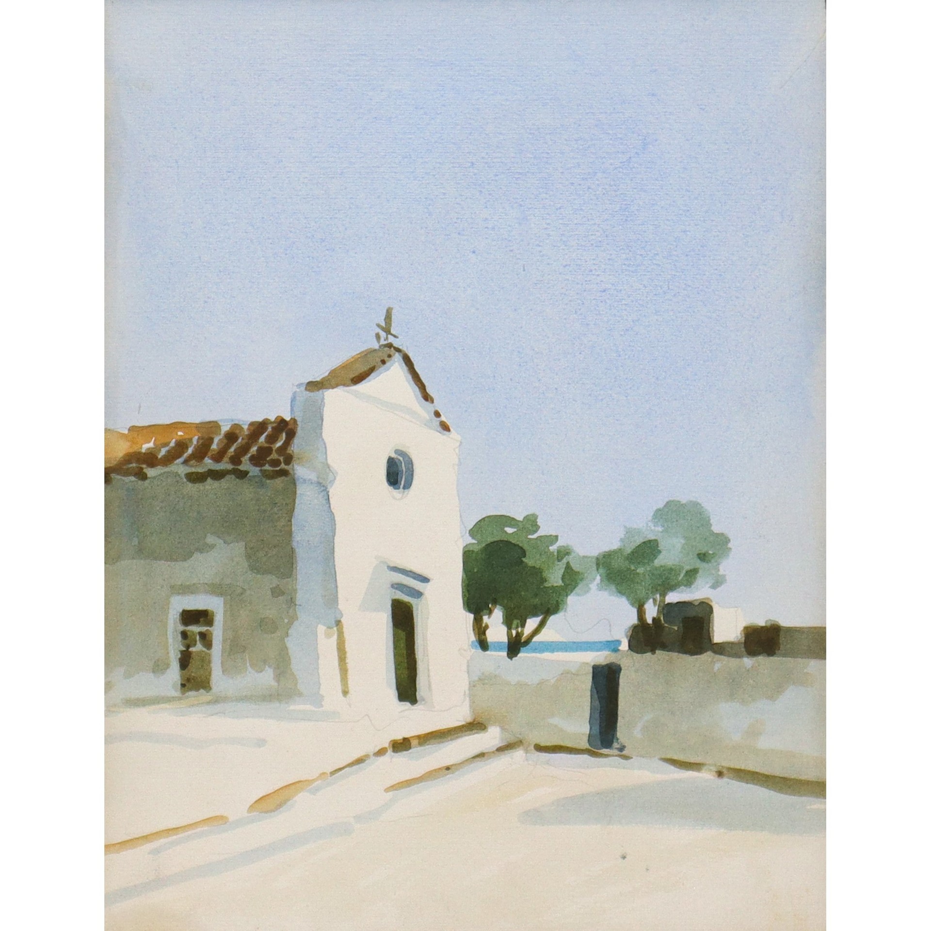 Paesaggio con chiesa, 20° secolo h cm 31X23 in cornice h cm 53X43 Acquarello su cartoncino