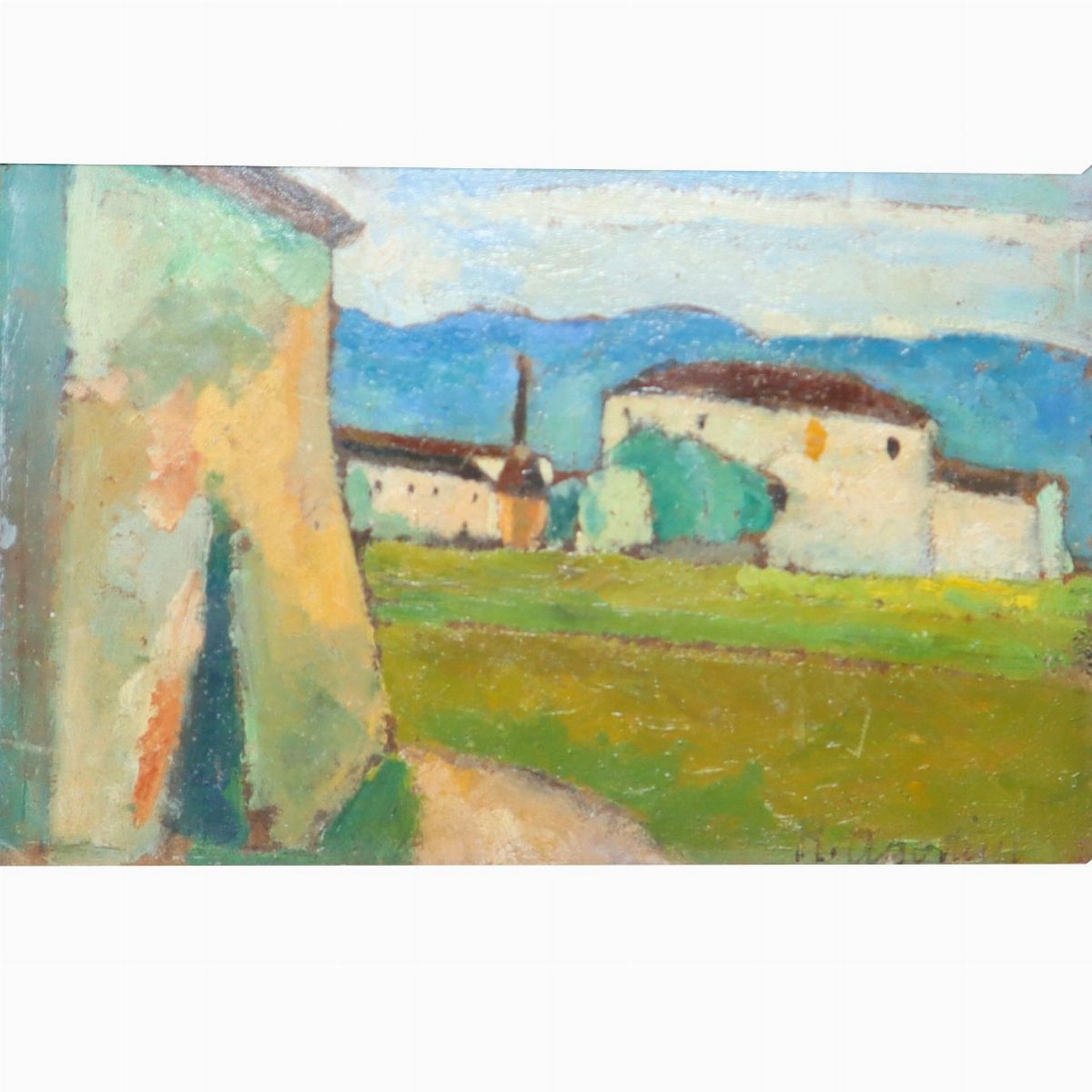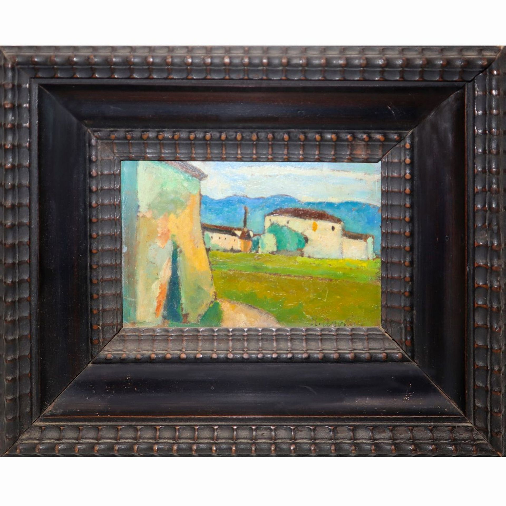 Renzo Agostini (Pistoia 1906 - 1989) - Paesaggio con case e colline H cm 12 x 17 / in cornice 26 x 31 Olio su cartoncino Firmato in basso a destra R.Agostini