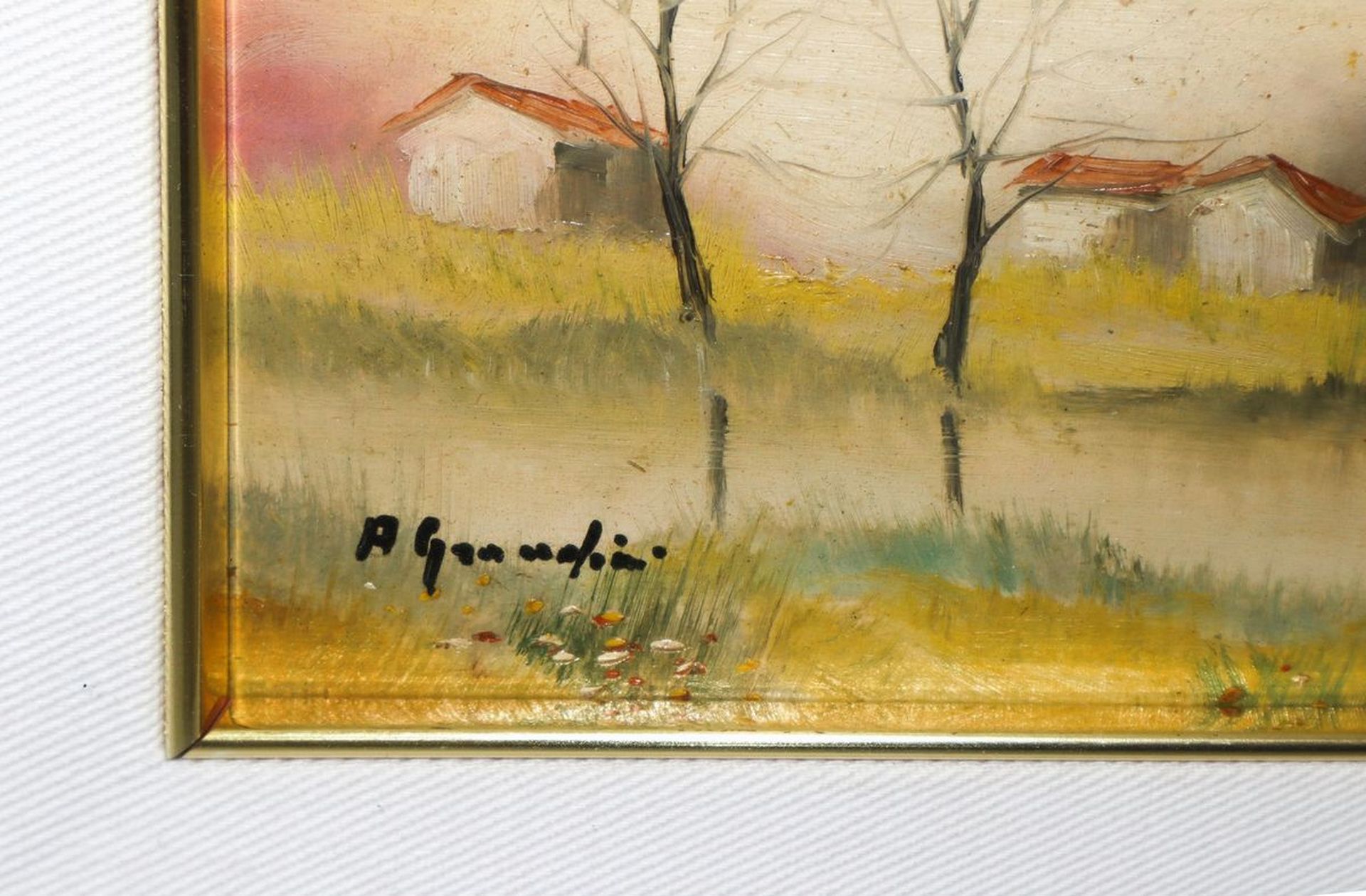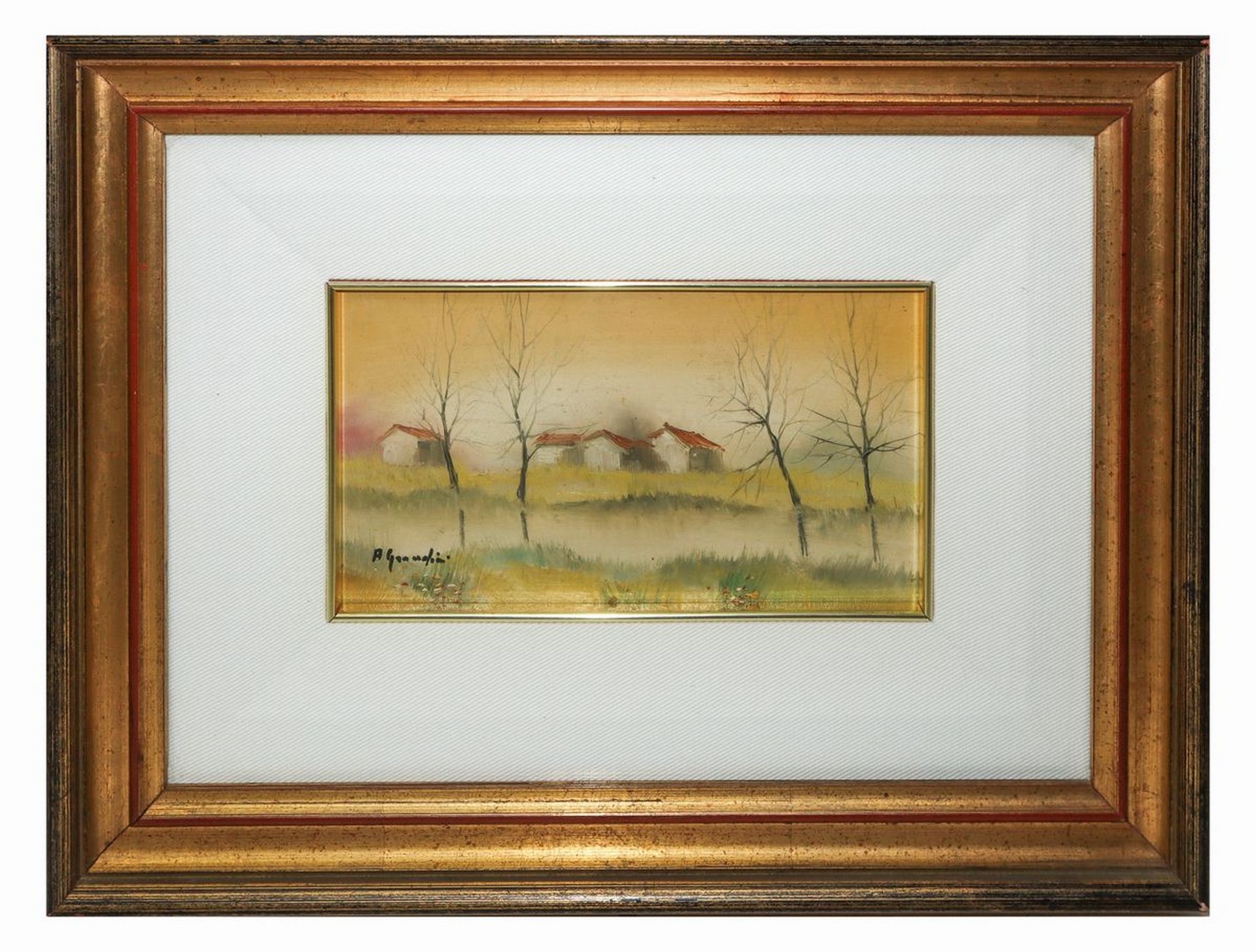 Case con alberi cm 14 x cm 25; in cornice cm 33 x cm 42 Dipinto ad olio su tavoletta Firmato in basso a sinistra A.Grandini.