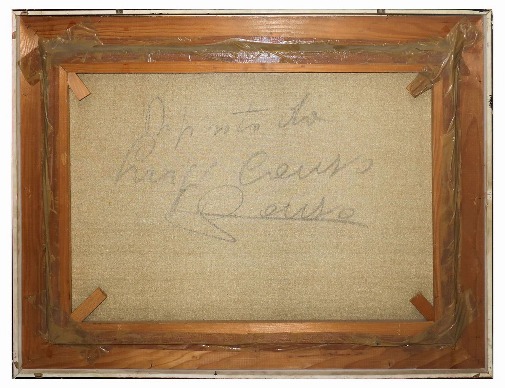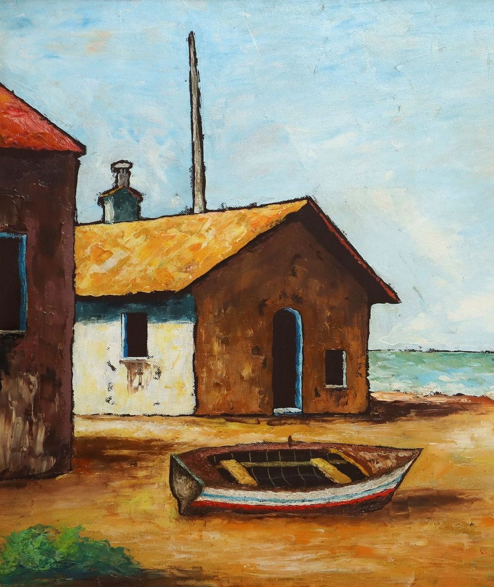 Barca a secco fra case cm 50 x cm 70; in cornice cm 64 x cm 84 olio su tela Firmato in basso a destra e sul retro L.Causio
