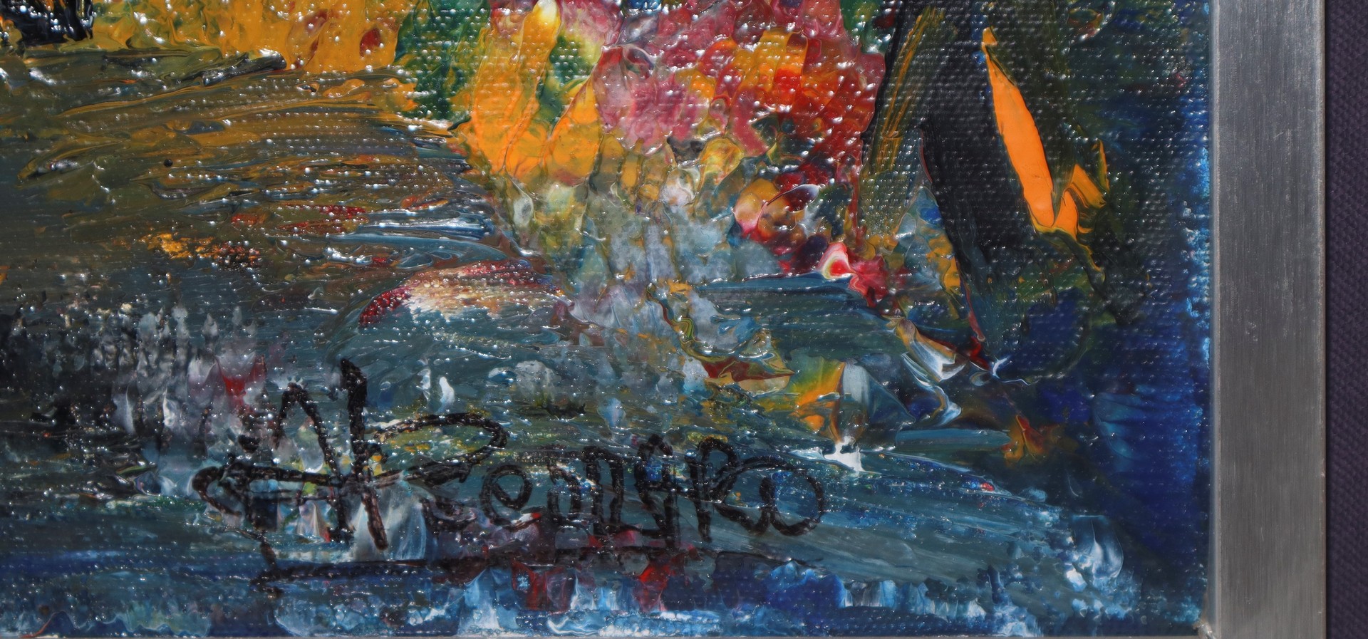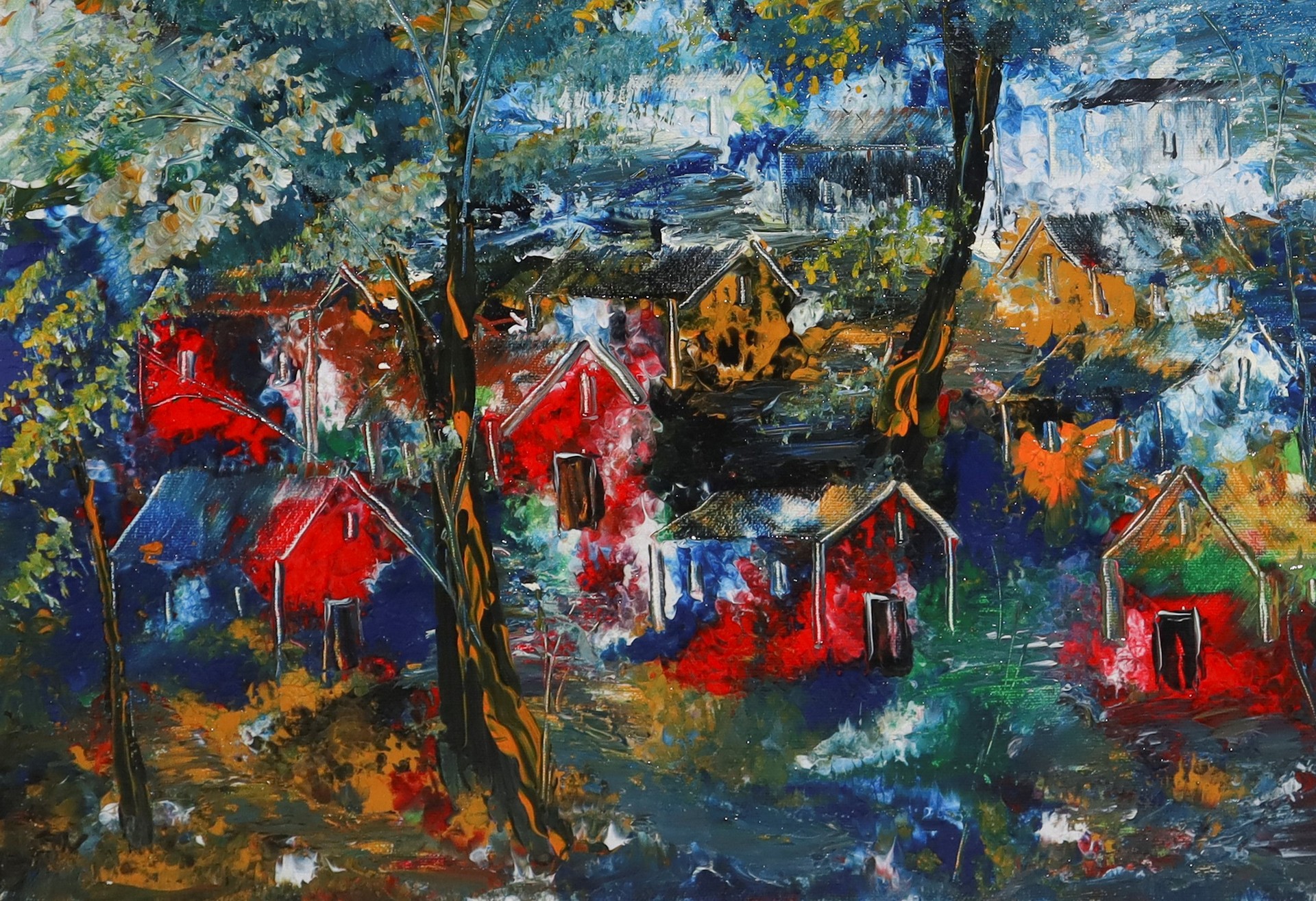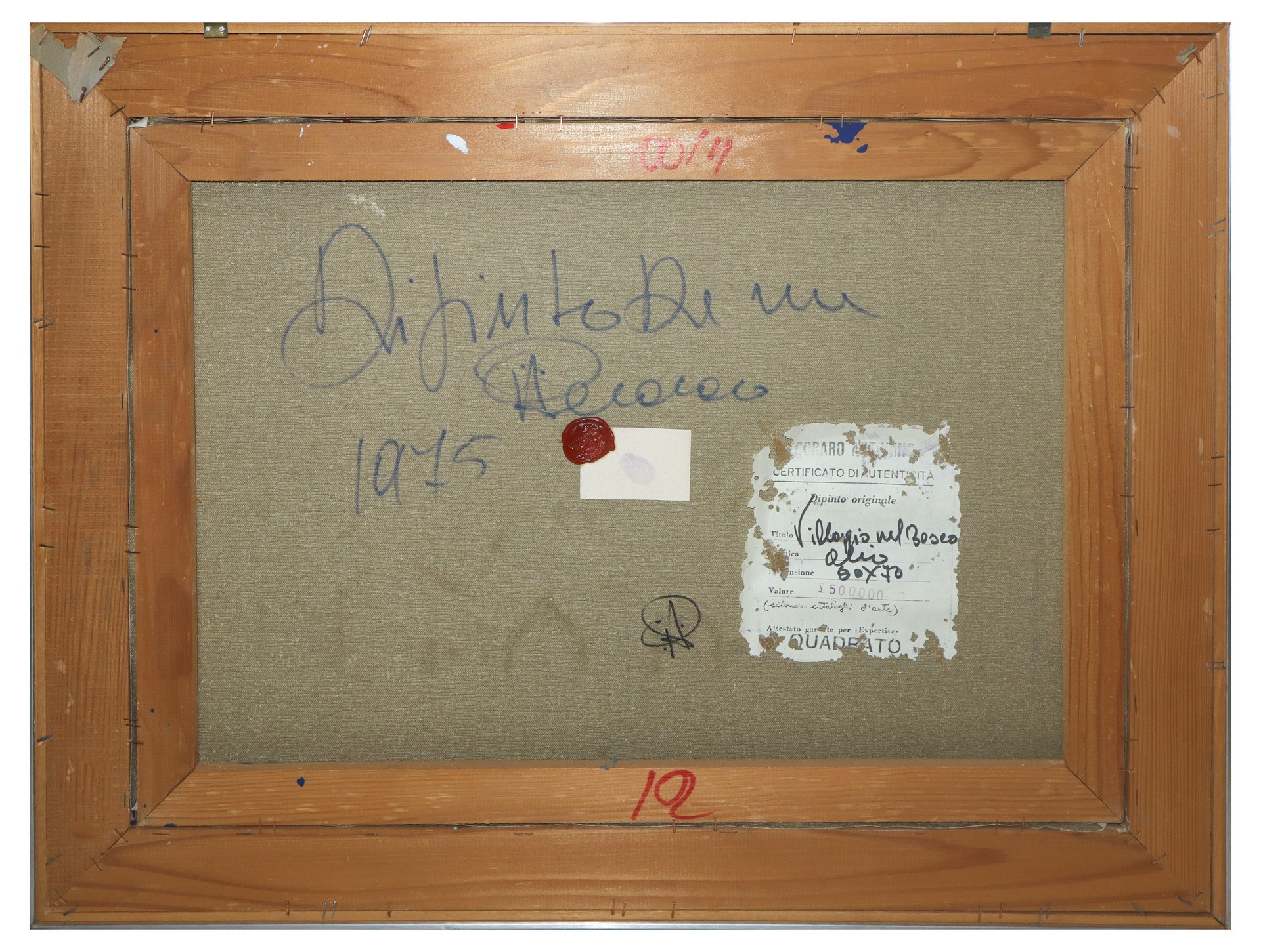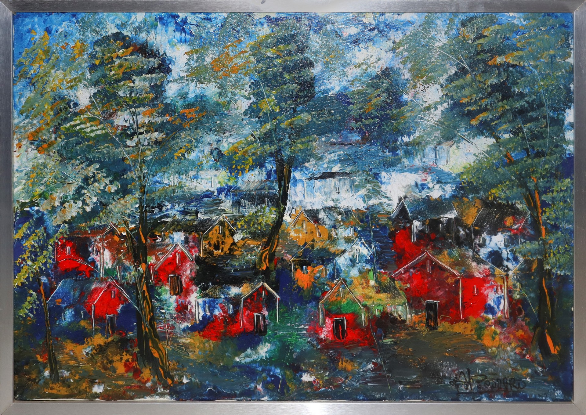 Villaggio nel bosco cm 50 x cm 70; in cornice cm 65 x cm 85 olio su tela Firmato in basso a destra Pecoraro e sul retro