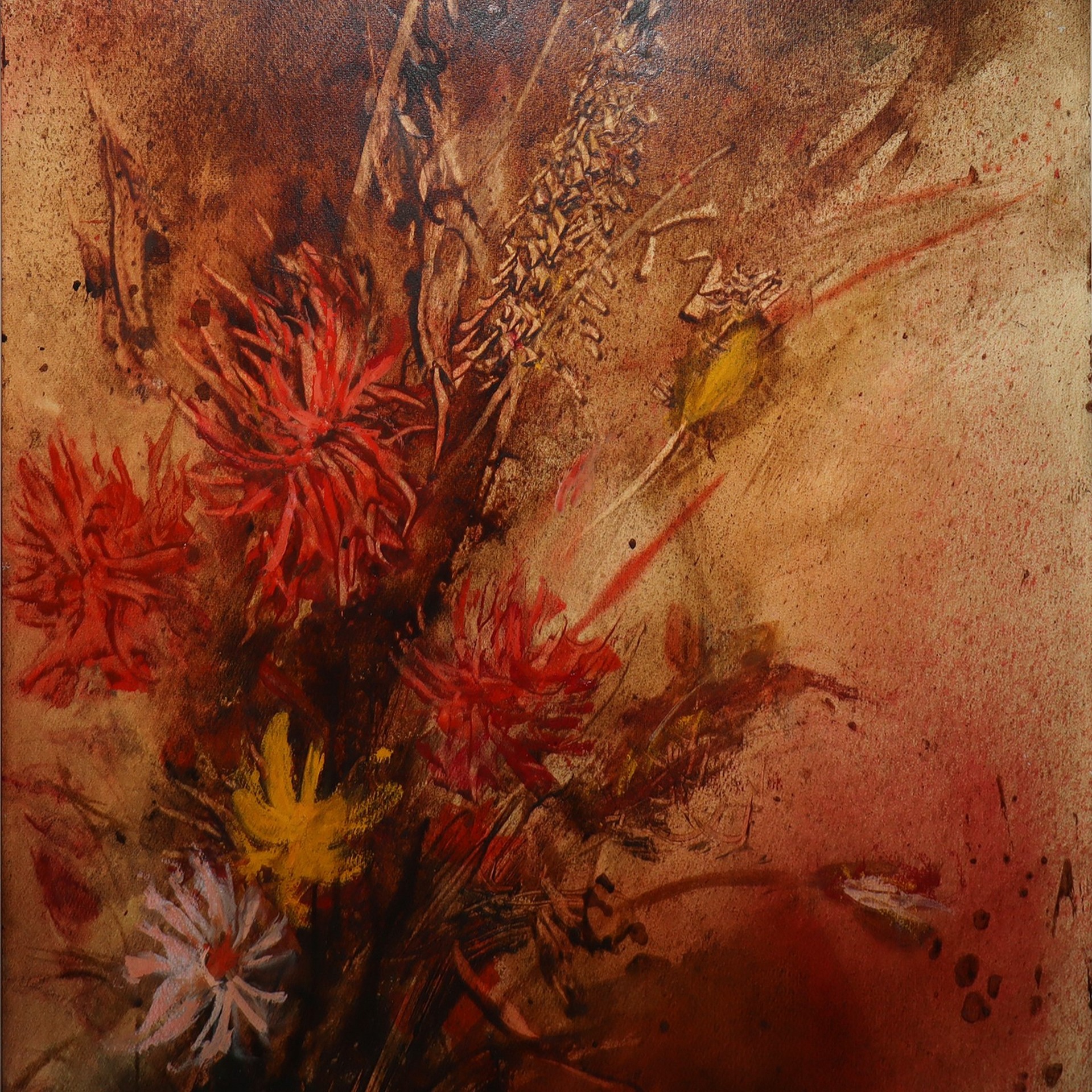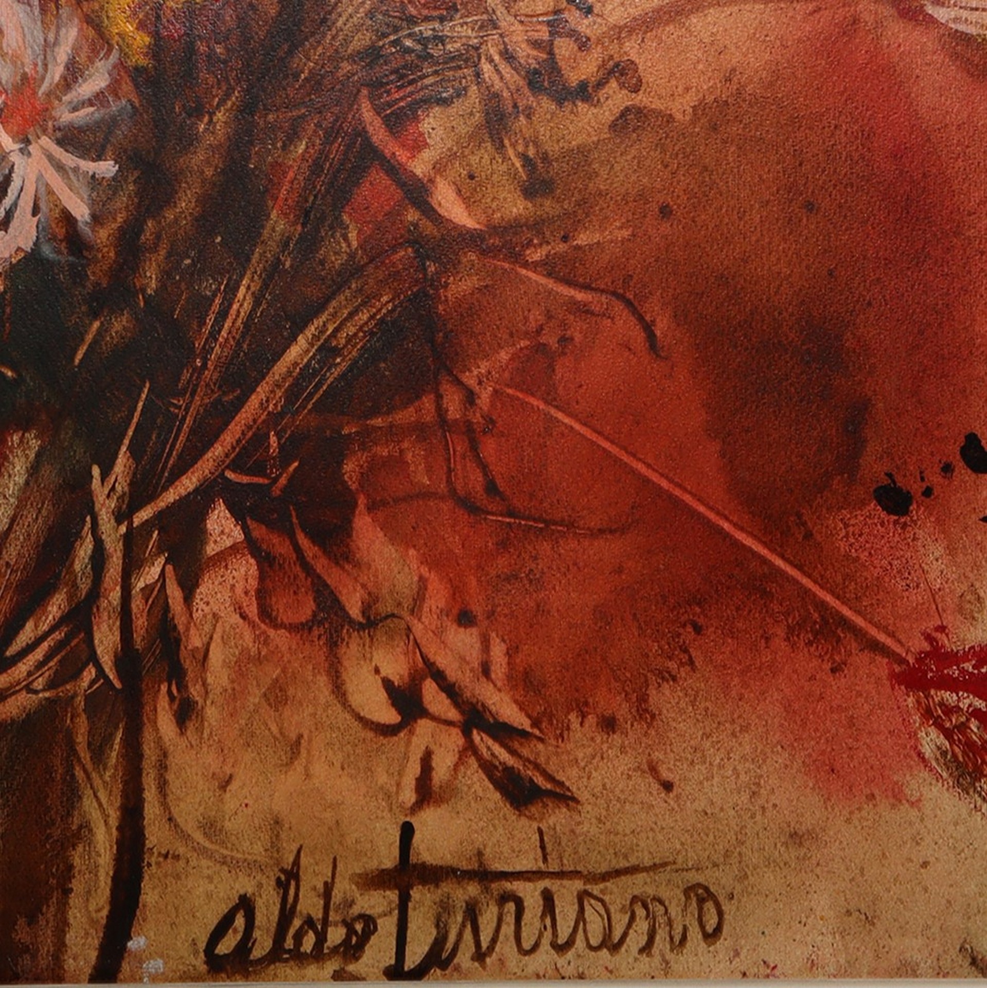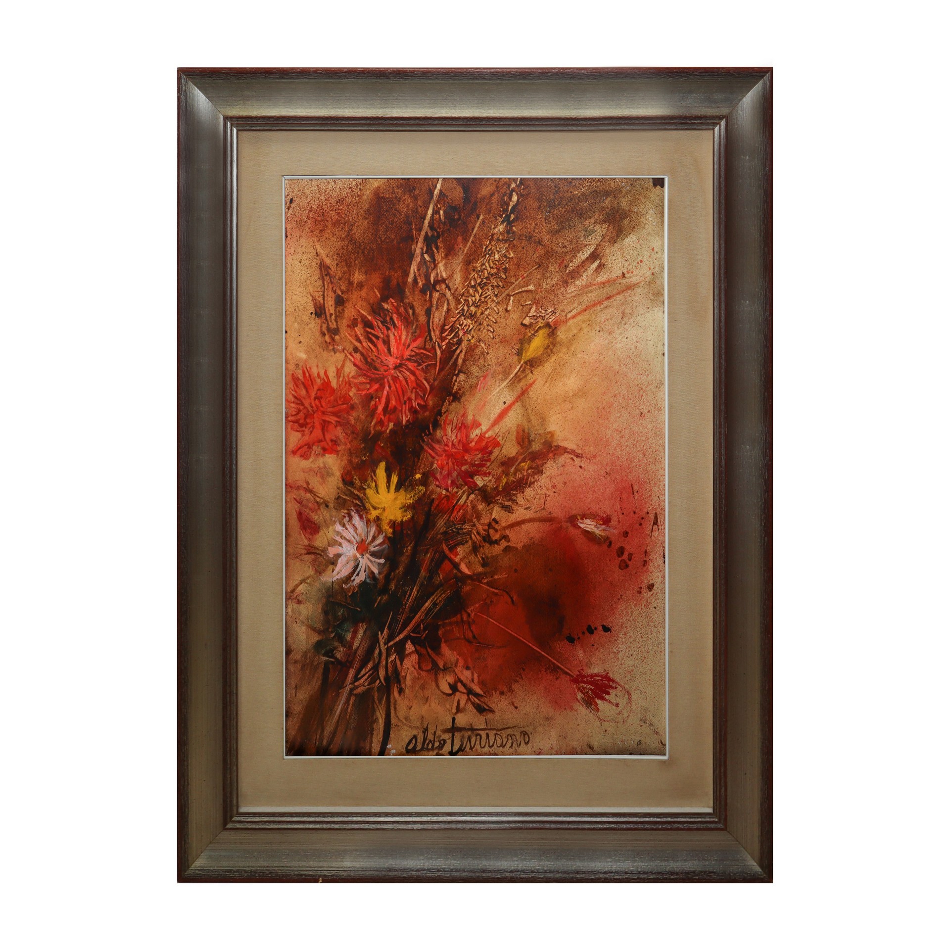 Aldo Turiano (catania 1938 - 2020) - Fiori, Catania 1973 h cm 70X50 in cornice h cm 92X73 Olio su cartoncino Firmato in basso al centro, titolato e datato sul retro