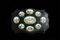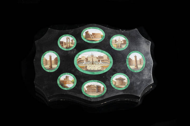 Placca sagomata in pietra di Lavagna, anni post 1874, con micromosaico centrale raffigurante Piazza San Pietro su base in vetro verde e intorno otto più piccoli circolari ed ovali raffiguranti alcuni dei monumenti più celebri di Roma (Colosseo, Pantheon; Tempio di Vesta, Piazza del Campidoglio, Colonna Aureliana e Traiania, i Fori Imperiali)