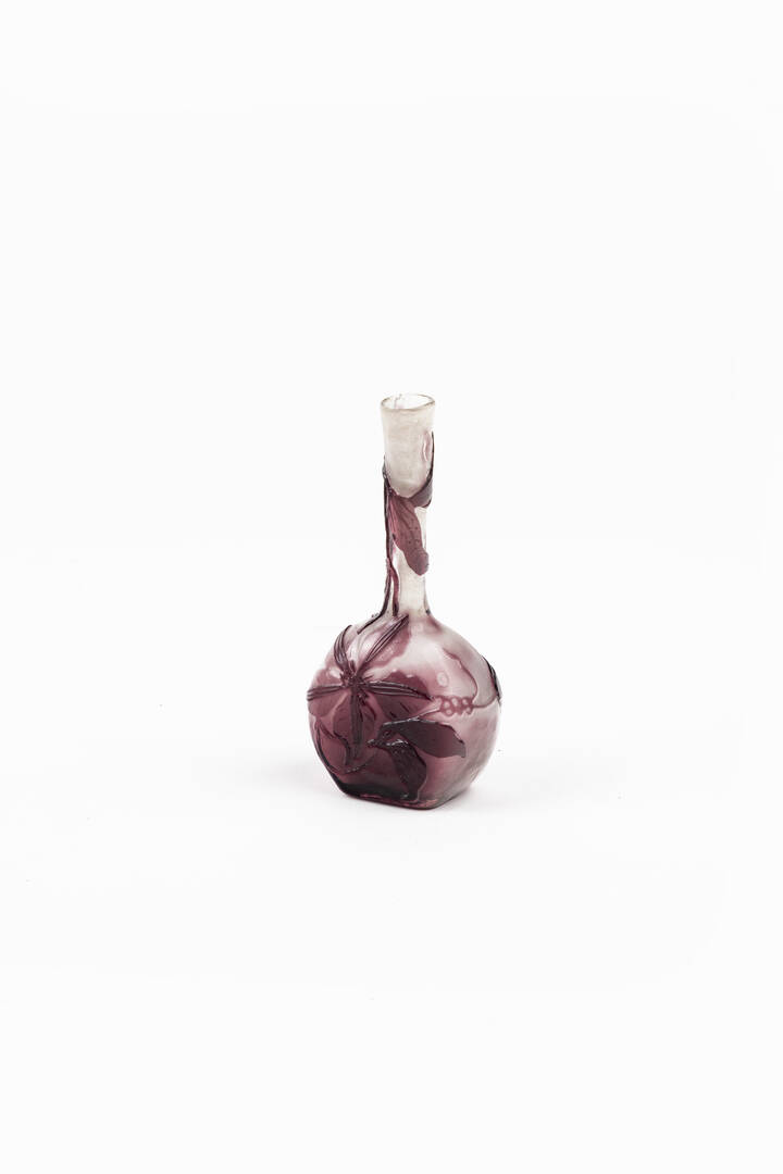 Vaso soliflore con base a bulbo in vetro doppio, decoro floreale nei toni del viola, inciso ad acido.