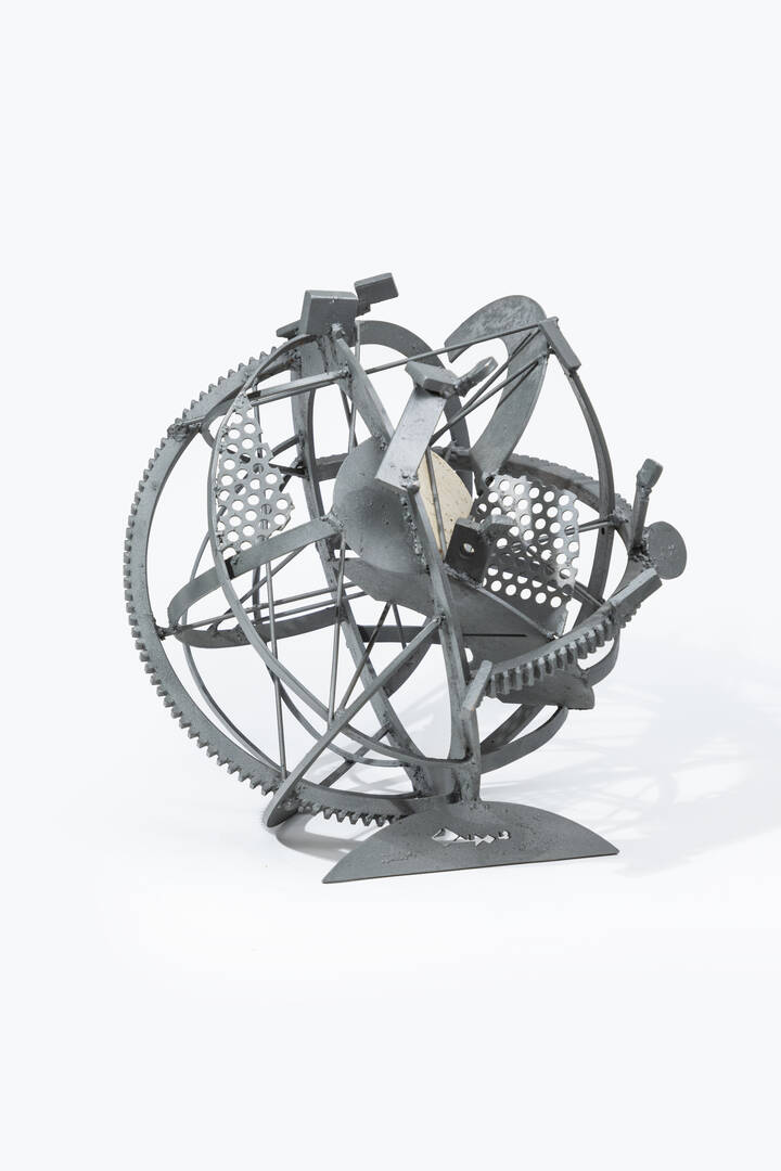 Diam. cm 43, scultura in ferro saldato con cilindro in travertino incastonato