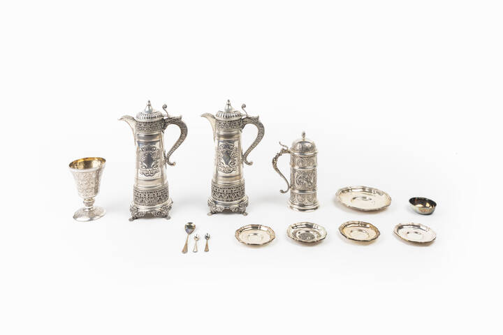 -1 tankard con base cilindrica; presa a pigna; manico a volute. Cesellato e sbalzato. Peso gr 550,5