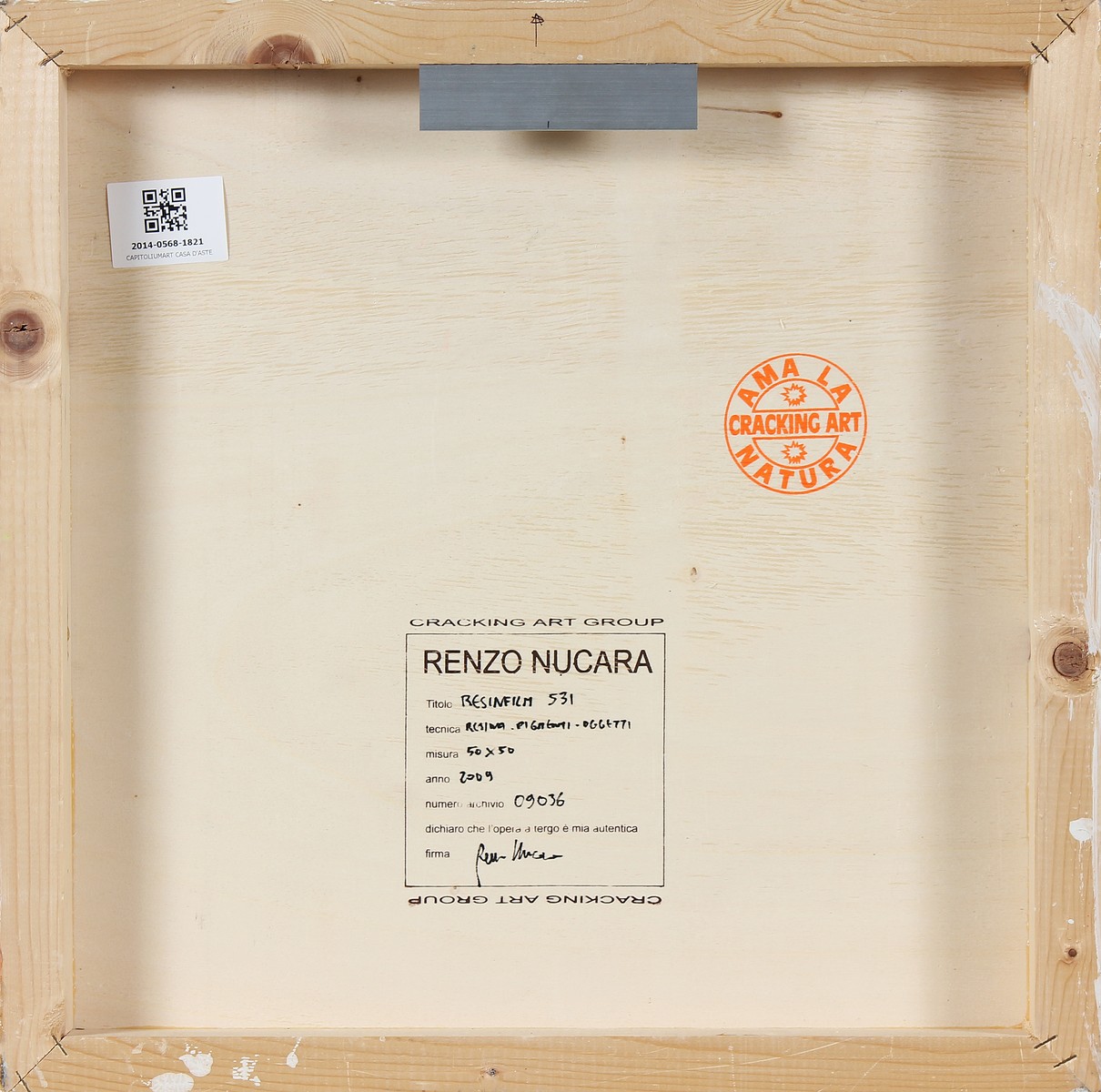 NUCARA RENZO (n. 1955) Resin film 531. Tecnica mista su tavola. Cm 50,00 x 50,00. Al retro cartiglio descrittivo e timbro a cura di ckracking art group. Autentica dell' artista su fotografia.