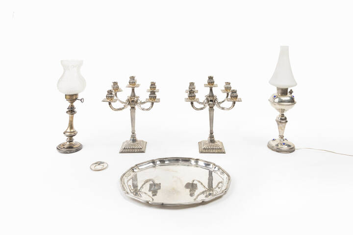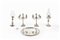 -coppia di candelieri a cinque luci; basi quadrate fesonate; braccia che dipartono dal centro decorate con teste di uccelli. Peso gr 637,7 e 609,1