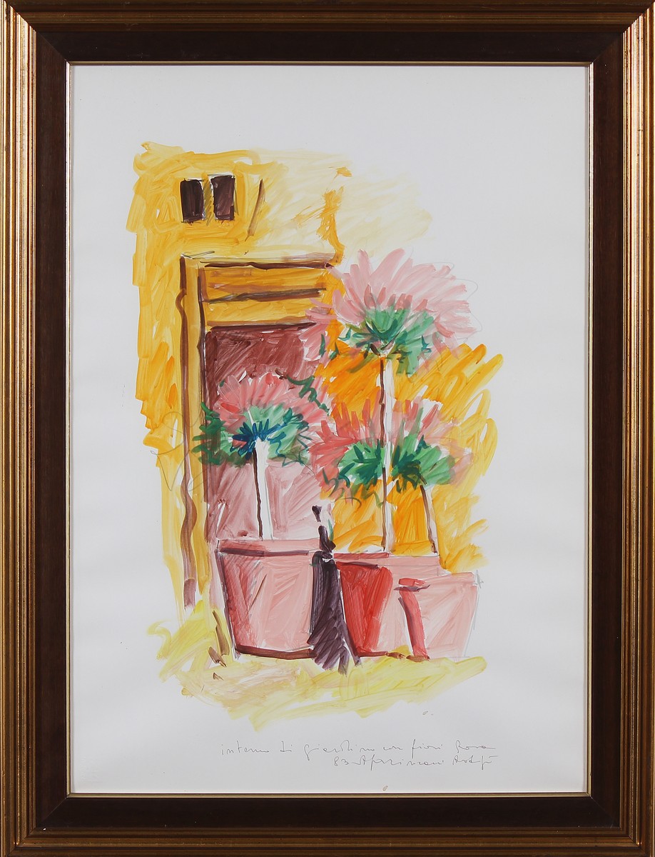 FACCINCANI ATHOS (n. 1951) Interno di giardino con fiori a Roma. 1983. Tecnica mista su carta. Cm 50,00 x 70,00. Titolo in basso al centro. Autentica dell'artista su fotografia come da documentazione allegata. Cornice presente