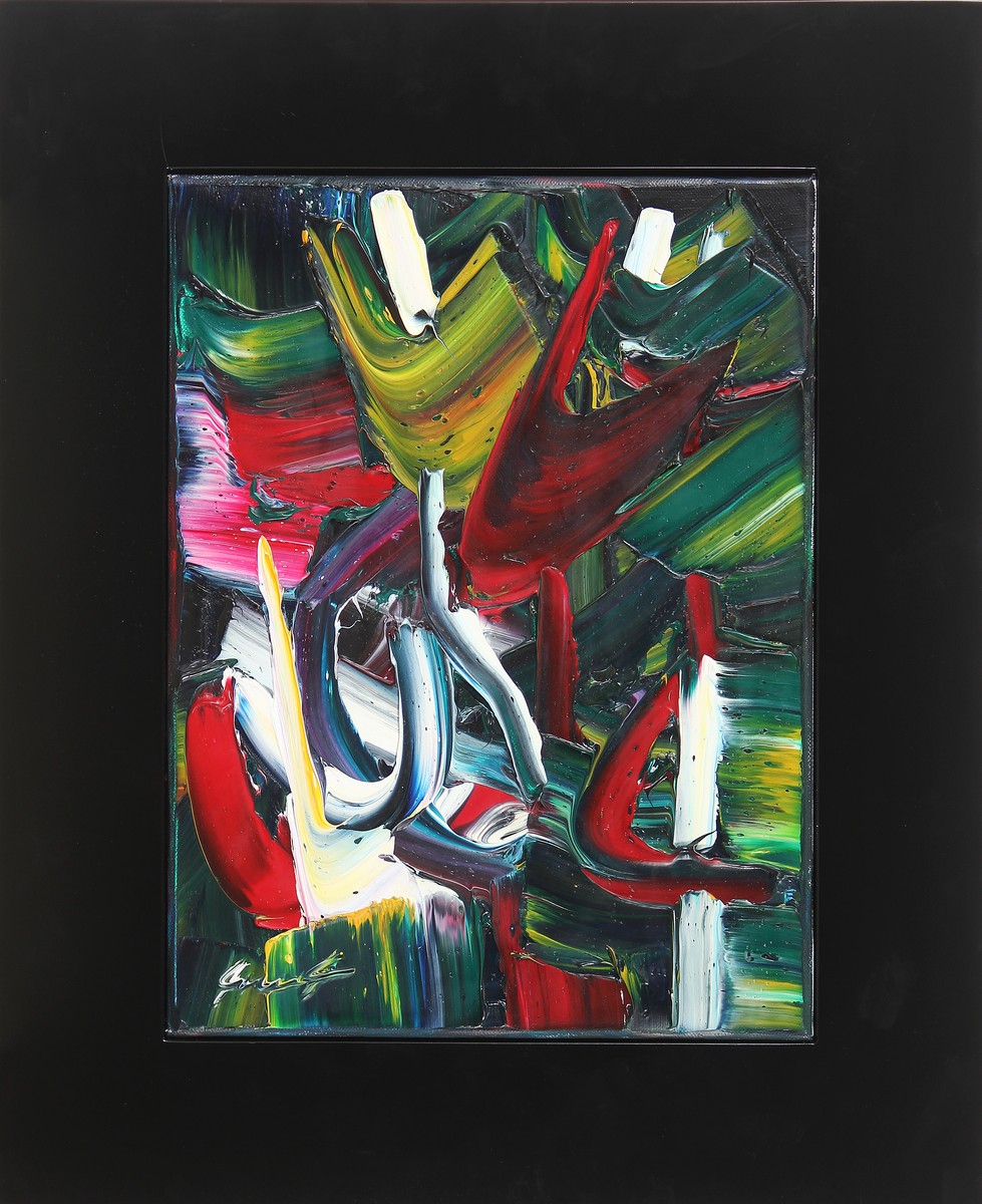 DE LUTTI PIERLUIGI (n. 1959) Astratto. Acrilico su tela. Cm 40,00 x 30,00. Firma al retro. Autentica dell'artista su fotografia. Cornice presente