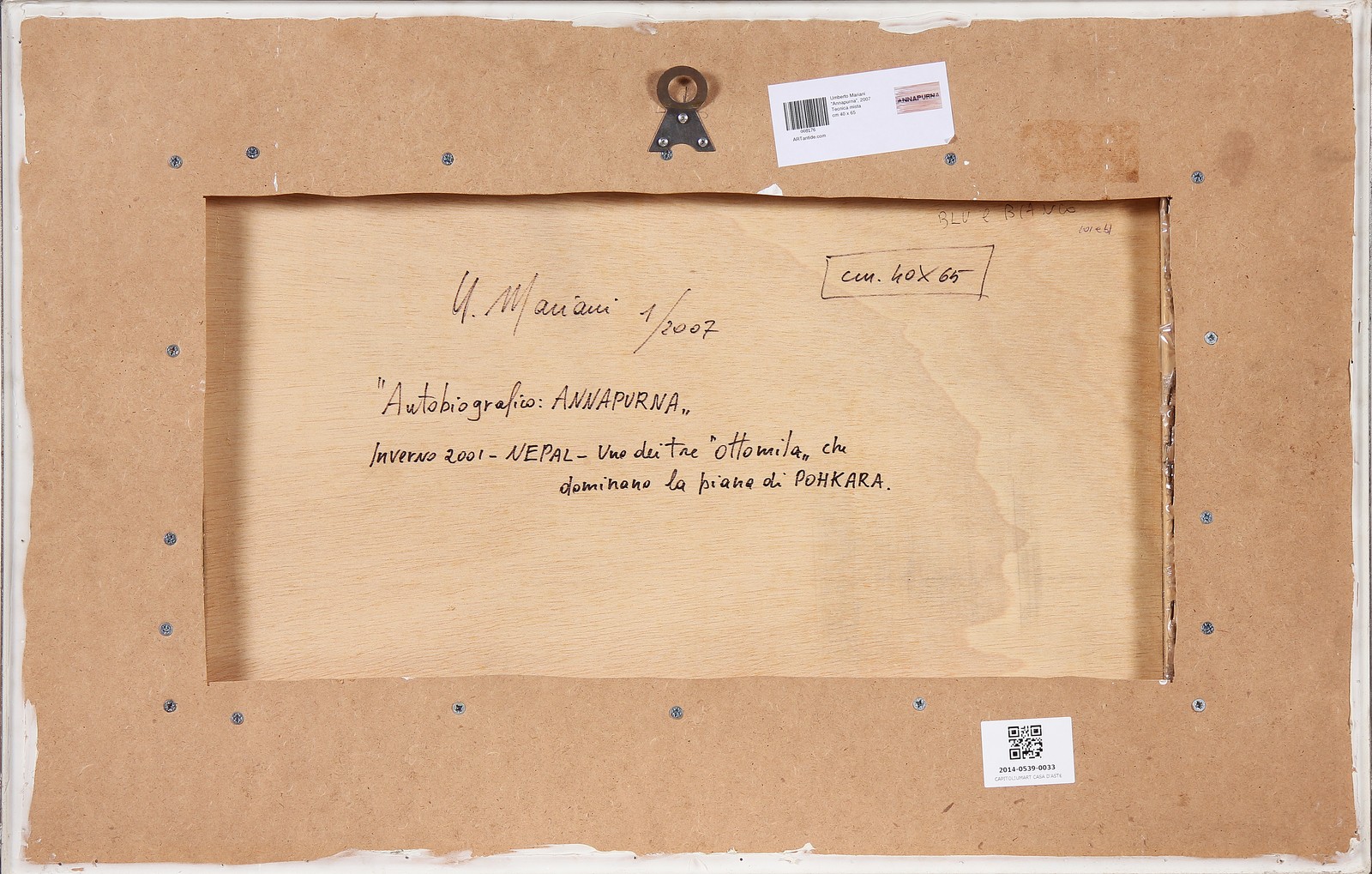 MARIANI UMBERTO (n. 1936) Annapurna. 2007. Tecnica mista su tavola. Cm 65,00 x 40,00. Al retro reca la firma, l'anno, il titolo, la descrizione dell'artista e il cartiglio Artantide.com.
