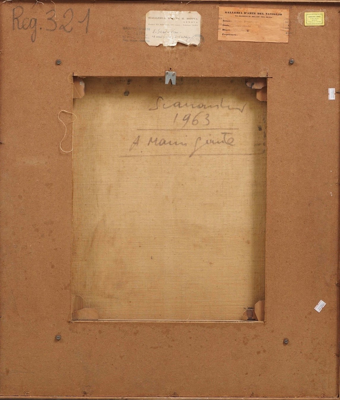 firmato in basso a destra, firmato, datato e intitolato al retro, Etichetta al retro della Galleria del Naviglio, Milano, Etichetta al retro della Galleria d'arte Rinaldo Rotta, Genova