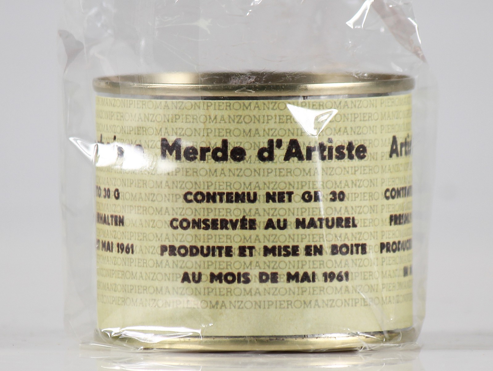 MANZONI PIERO (1963 - 2013) D'apres. Merda d'artista. Latta. Cm 7,50 x 6,00 x 7,50. Firma a stampa. Edizione n. 10. Merda d'artista dell' anniversario 2013. Prodotta e inscatolata da: Fondazione Piero Manzoni, Milano. Confezione originale con impronta digitale a rilievo dell' artista