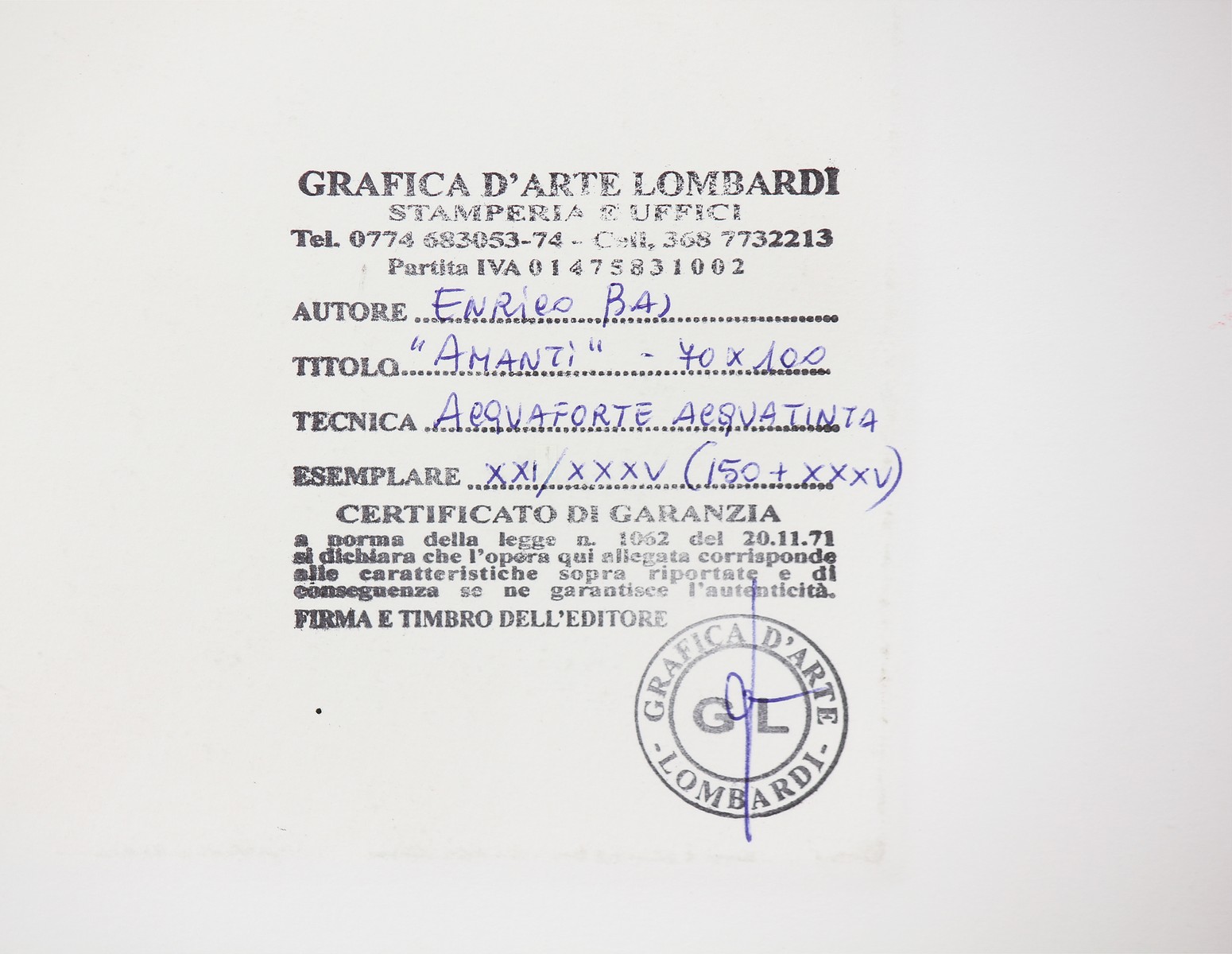 BAJ ENRICO (1924 - 2003) Amanti. Acquaforte, acquatinta. Cm 100,00 x 70,00. XXI/XXV. Dimensioni lastra: cm 59x80. Timbro a secco - Grafiche d'arte Lombardi, Roma - in basso a sinistra. Firma e tiratura in basso a matita.