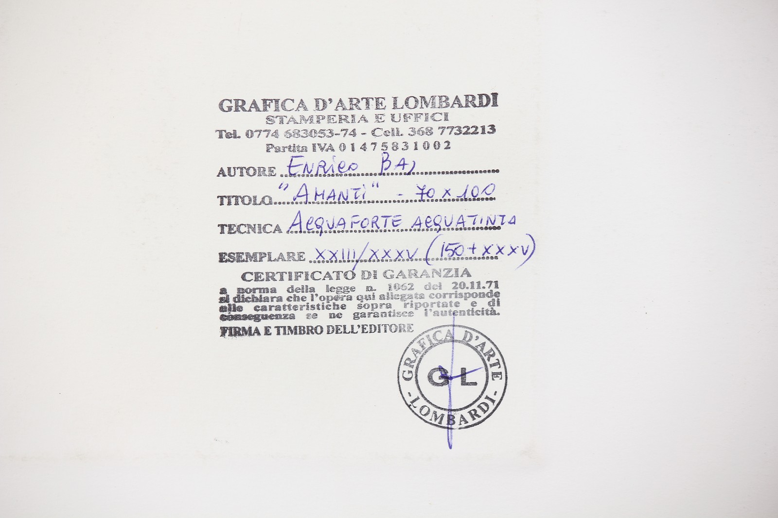 BAJ ENRICO (1924 - 2003) Amanti. Acquaforte, acquatinta. Cm 100,00 x 70,00. XXIII/XXV. Dimensioni lastra: cm 59x80. Timbro a secco - Grafiche d'arte Lombardi, Roma - in basso a sinistra. Firma e tiratura in basso a matita.