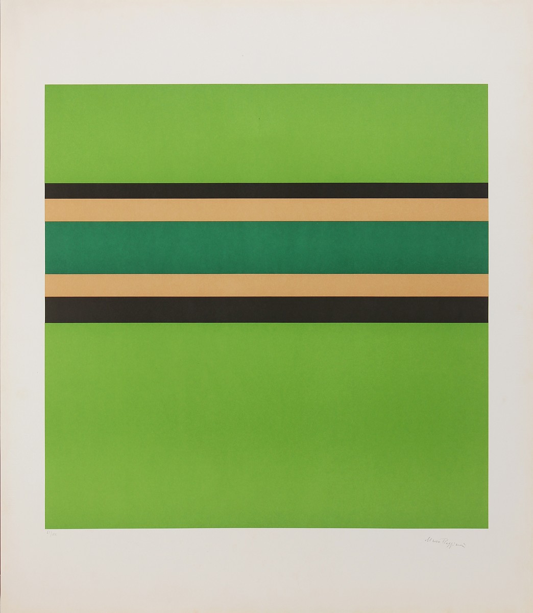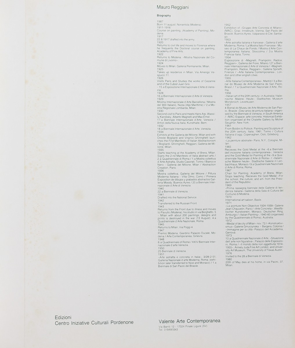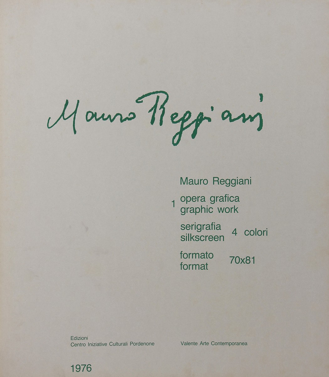 REGGIANI MAURO (1897 - 1980) Mauro Reggiani (cartella). 1976. Serigrafia. Cm 70,00 x 81,00. Cartella completa contente n.1 serigrafia a 4 colori numerata e firmata dall'autore a matita. Edizioni Centro Iniziative Culturali Pordenone, Valente Arte Contemporanea. Esemplare: 61/125.
