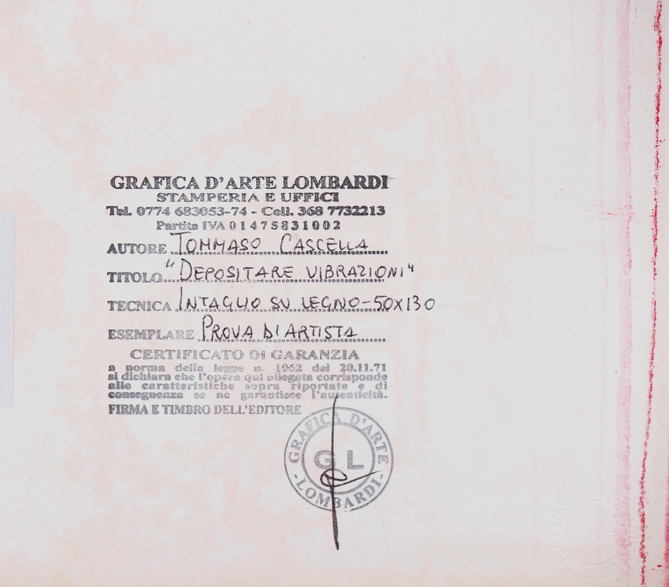 CASCELLA TOMMASO (n. 1951) Depositare vibrazioni. Acquaforte. Cm 130,00 x 50,00. Senza tiratura. Tiratura e firma in basso a gessetto. Timbro a secco - Grafica D'Arte Lombardi, Roma - in basso a sinistra. Al retro timbro - Grafica D'Arte Lombardi, Roma.