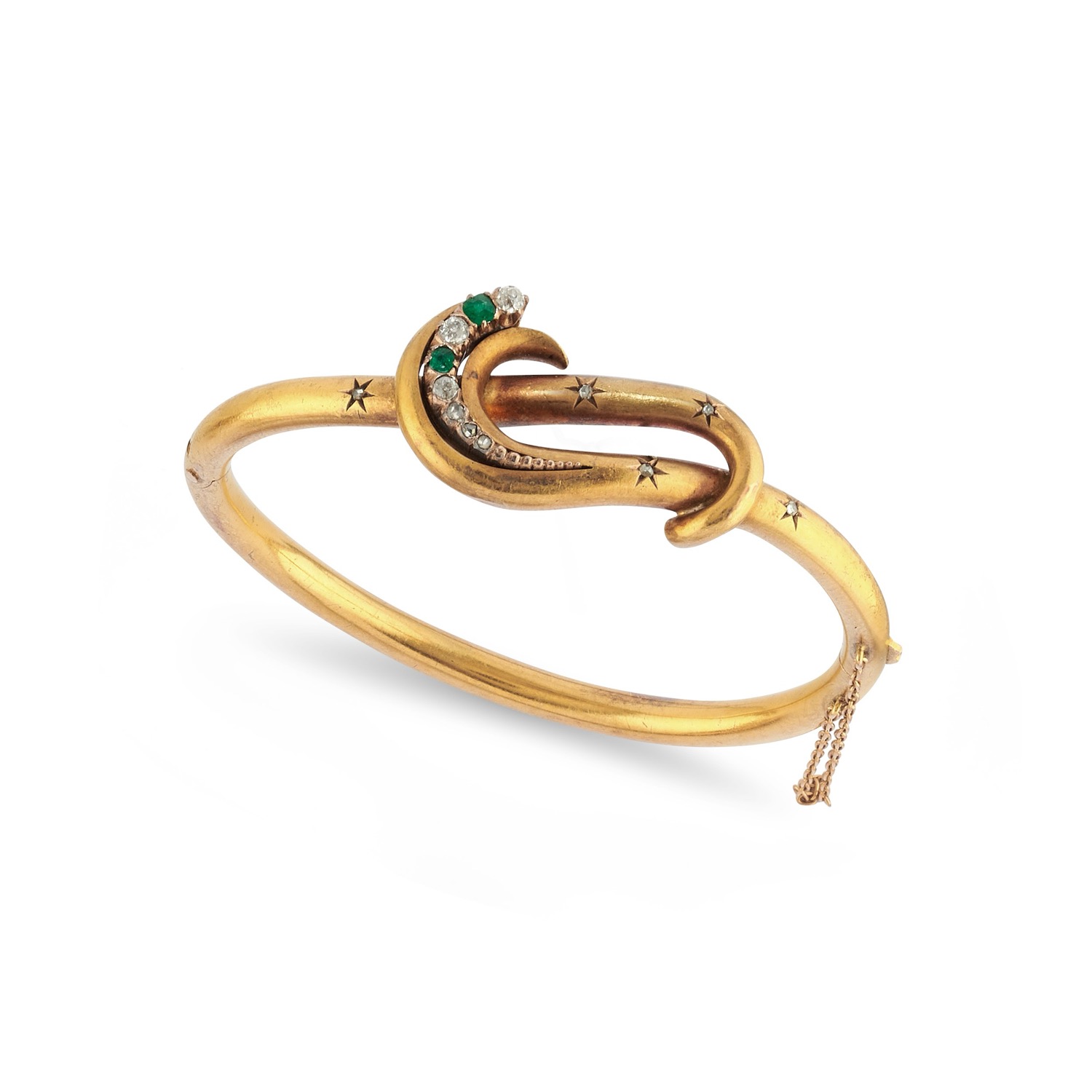 rigido, in canna vuota, motivo a nodo e decorato con diamanti taglio rosa e smeraldi.