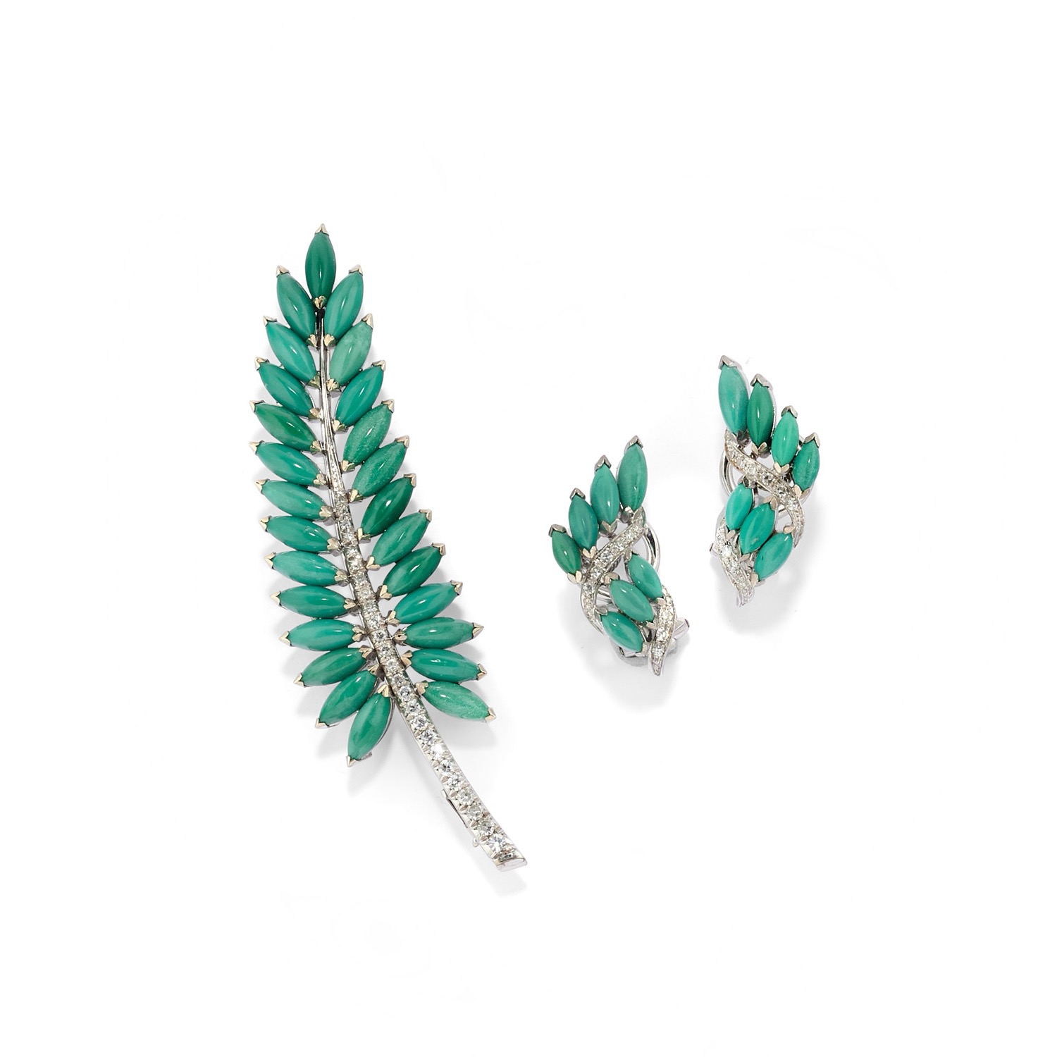 motivo a foglia, con turchesi taglio marquise cabochon e diamanti taglio huit-huit, orecchini con chiusura a clip.