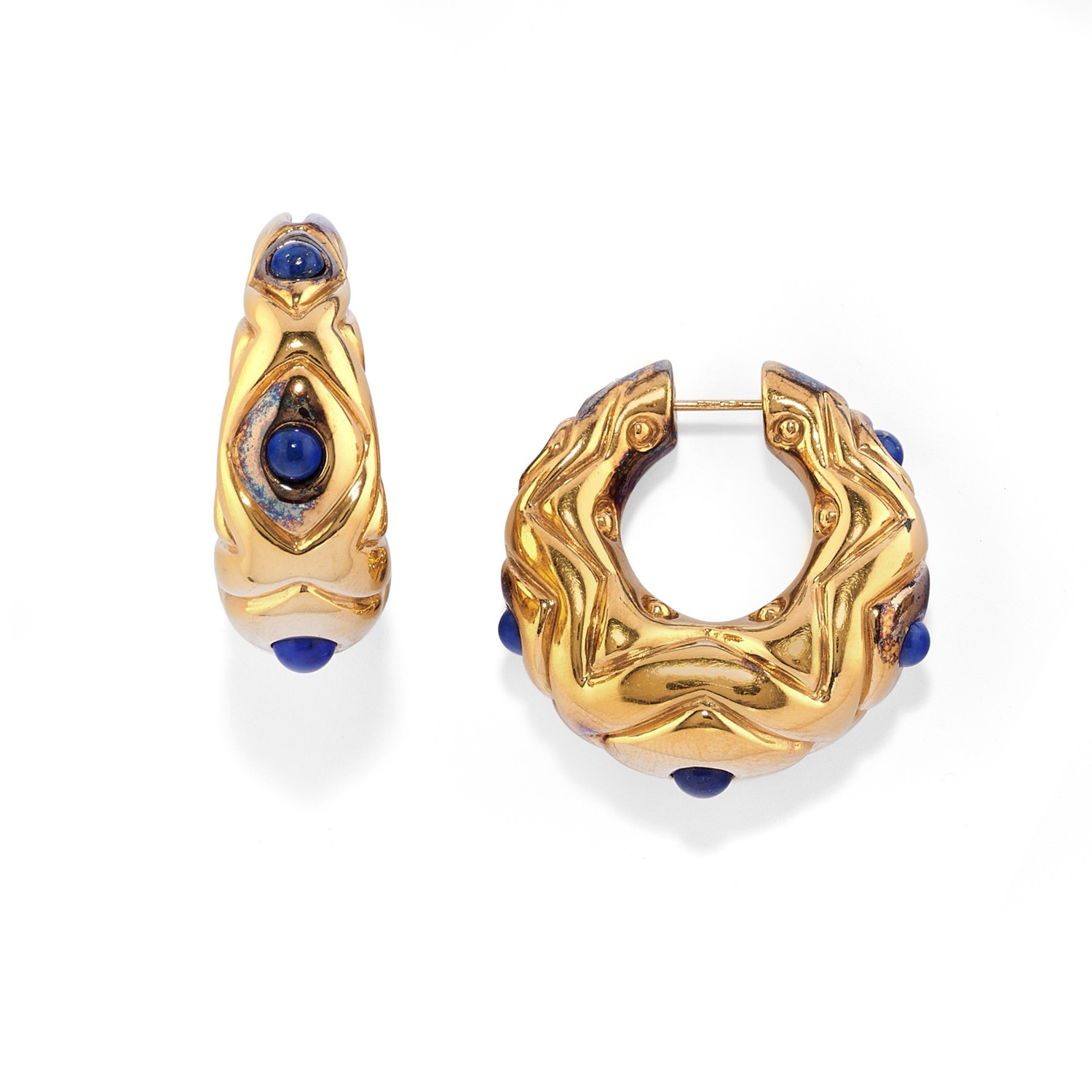 bombati, in canna vuota, decorati con lapislazzuli cabochon, chiusura con perno a scatto, difetti (lapislazzuli mancante).