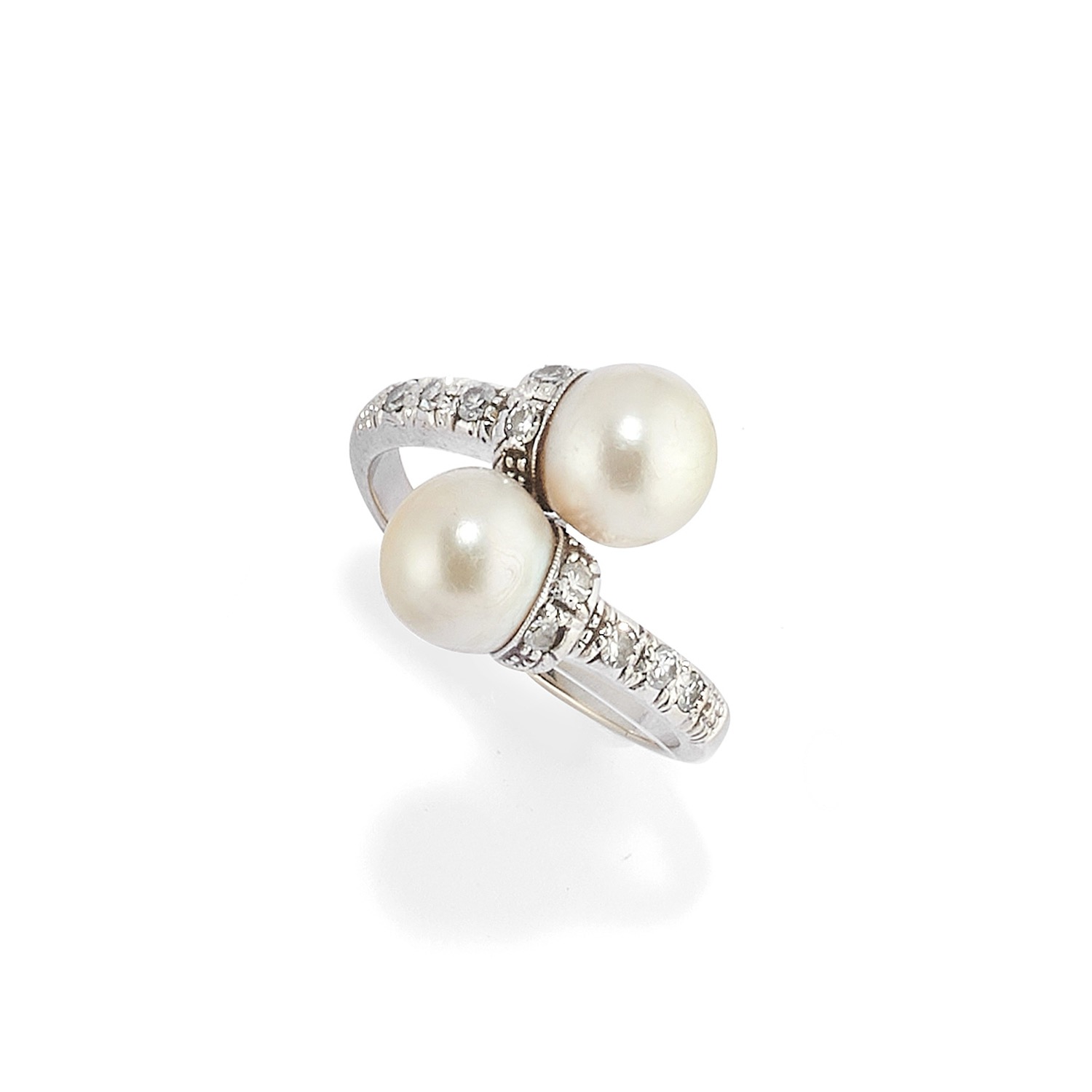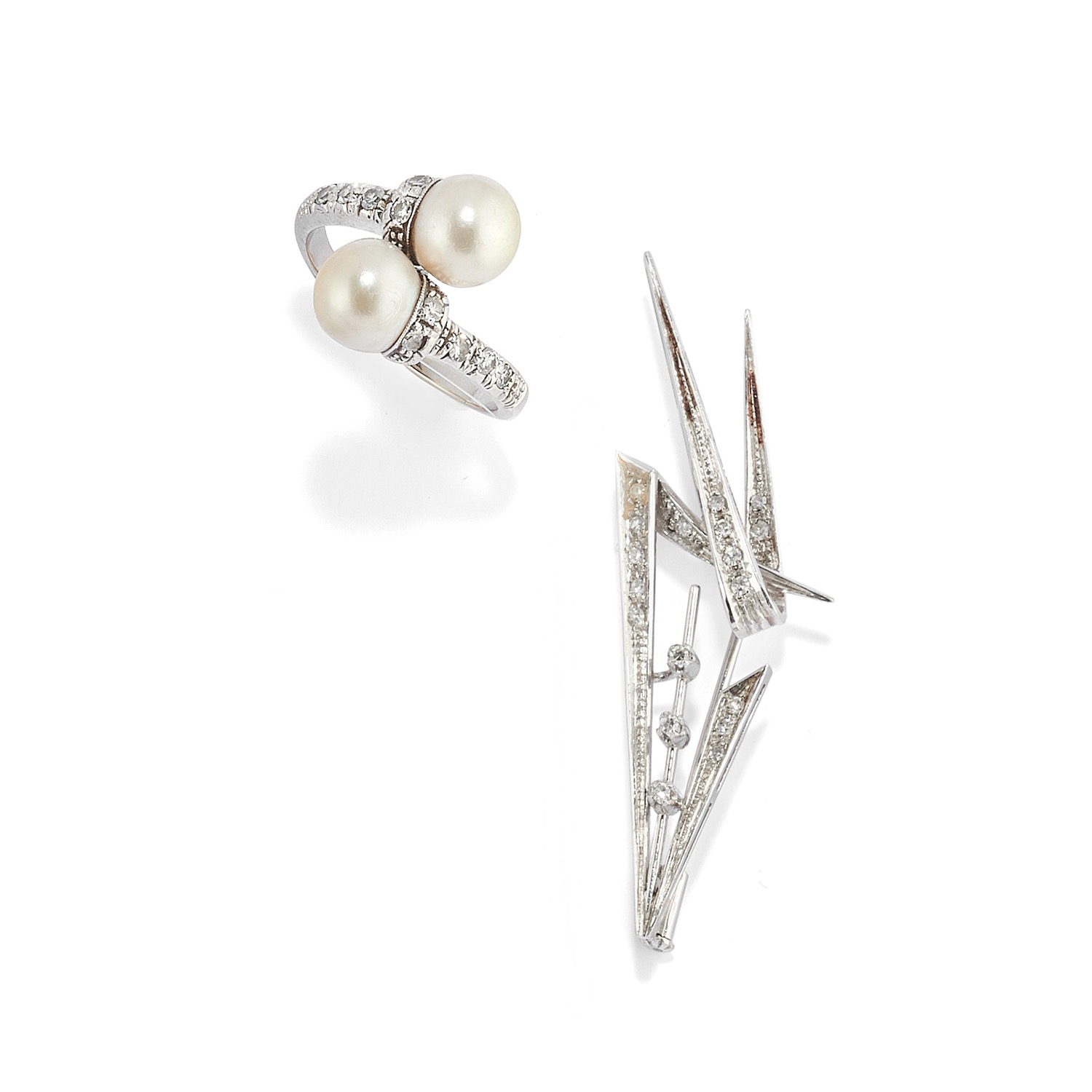 anello realizzato a contrariè con perle coltivate di mm 5,00 circa e diamanti taglio huit-huit a decoro e spilla realizzata a motivo geometrico con diamanti taglio huit-huit.