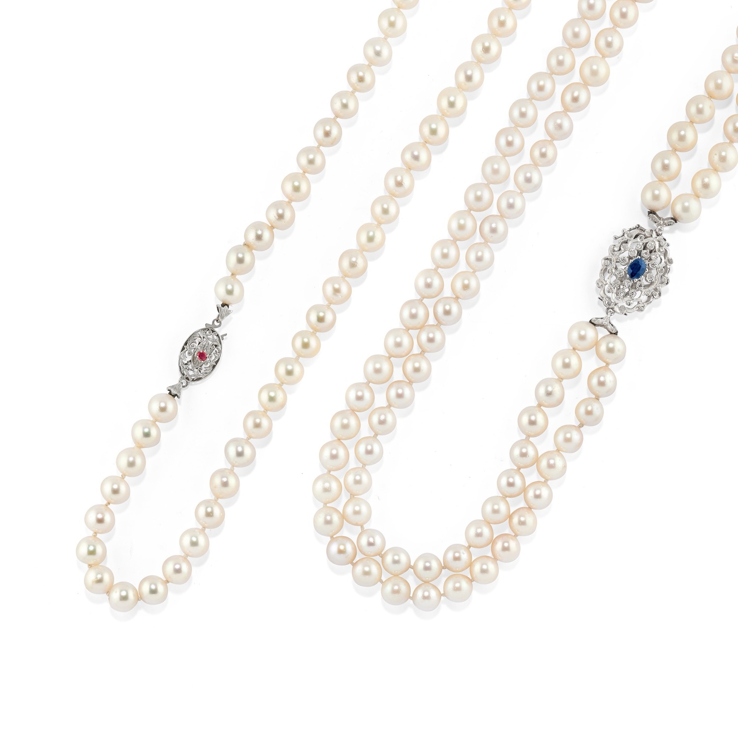 una realizzata a due fili di perle coltivate di mm 8,00 circa e chiusura con zaffiro taglio ovale e diamanti taglio huit-huit e l'altra realizzata a un filo di perle coltivate di mm 8,00 circa e chiusura con rubino taglio rotondo.