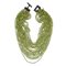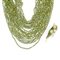 collana multifili con peridoti e boules in oro, firmata Evanueva, e spilla a foggia di mughetto con foglia in giadeite, fiori in cristallo di rocca e diamanti taglio brillante, punzoni francesi.