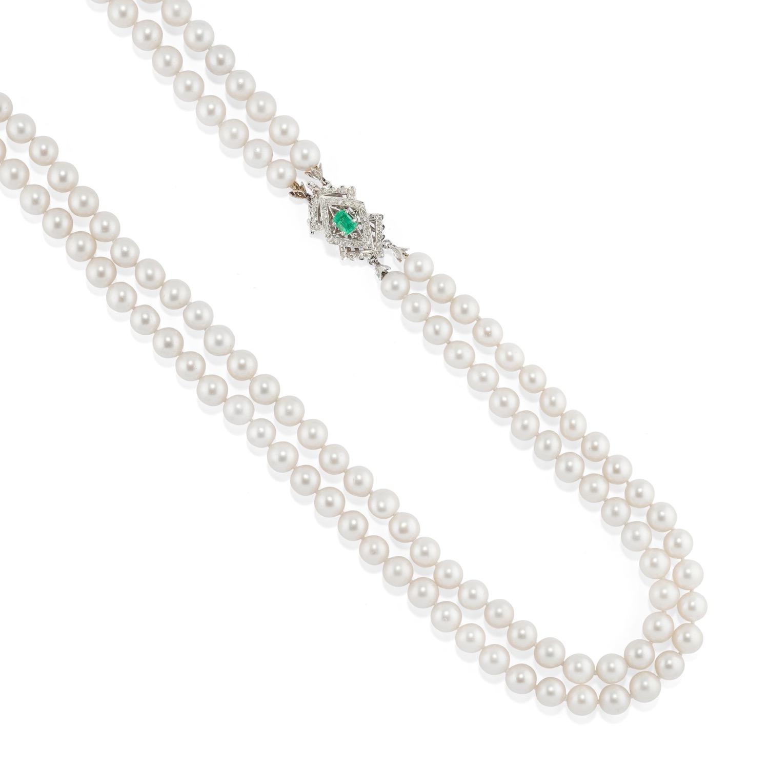a due fili di perle coltivate di mm 7,50 circa, chiusura impreziosita da smeraldo taglio rettangolare a contorno ottagonale di ct 0,50 circa e diamanti taglio huit-huit per totale ct 0,30 circa, difetti (mancanza di materiale in corrispondenza di un angolo dello smeraldo, un piccolo diamante mancante).