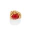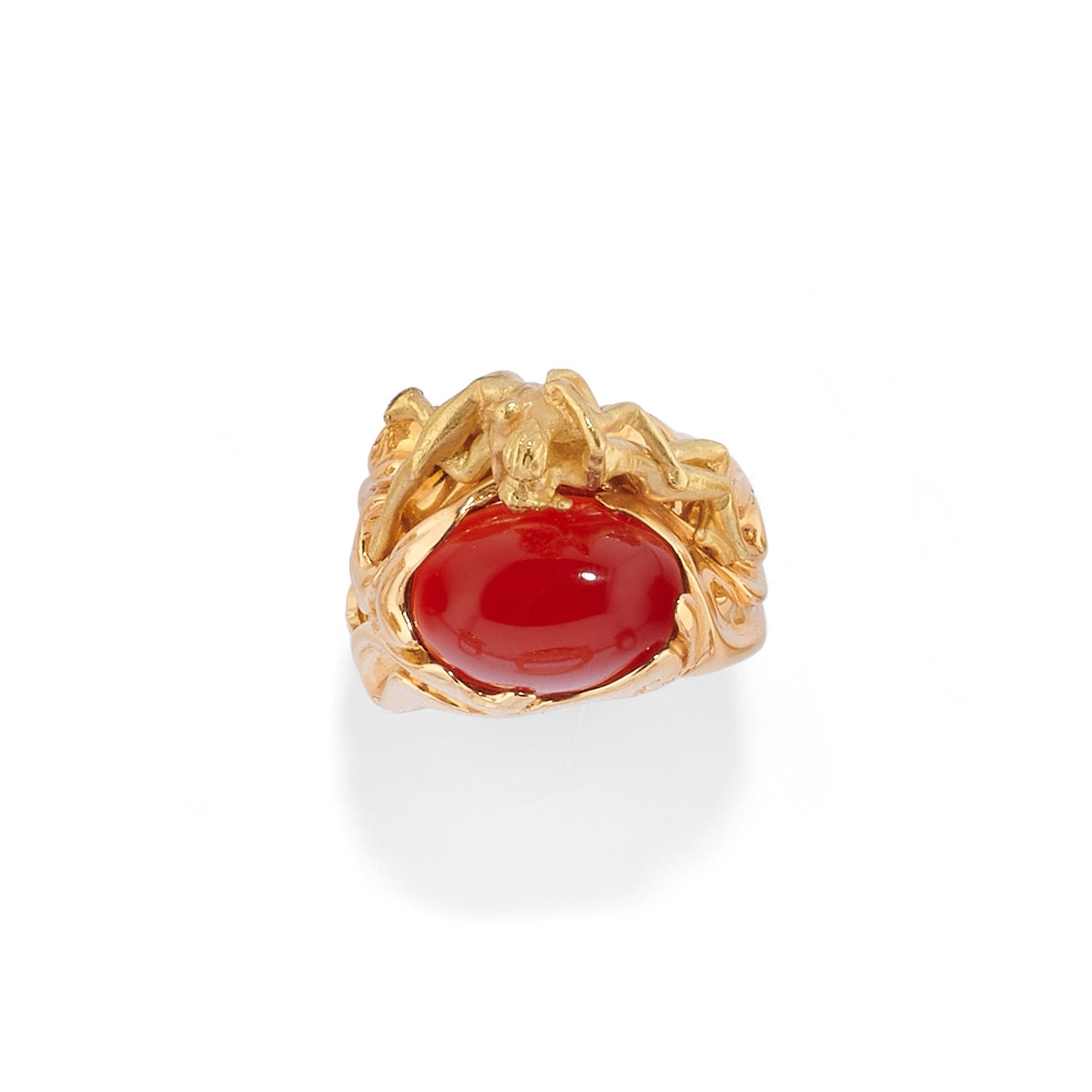 montatura a scultura con amanti, decora da corniola taglio ovale cabochon, gambo aperto.