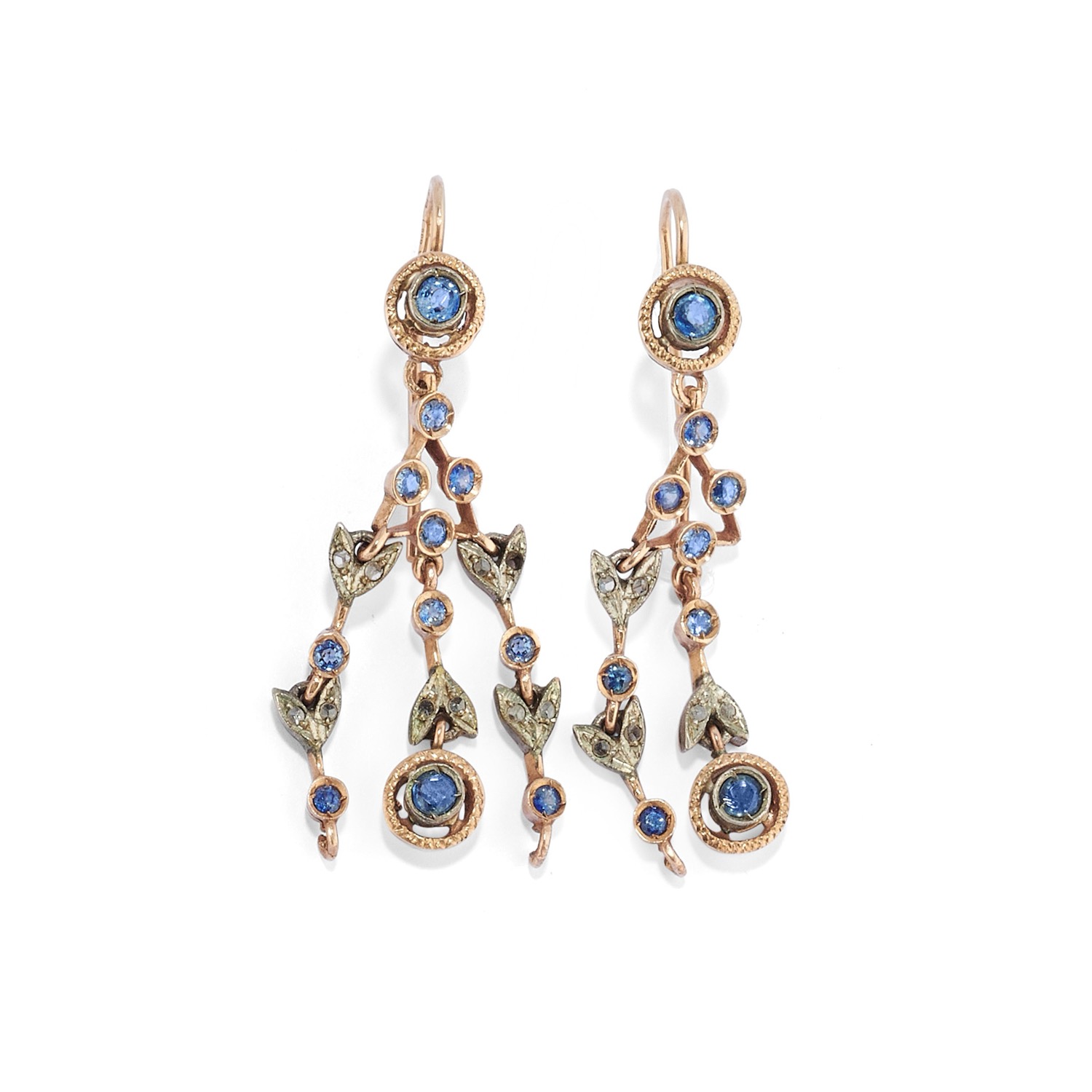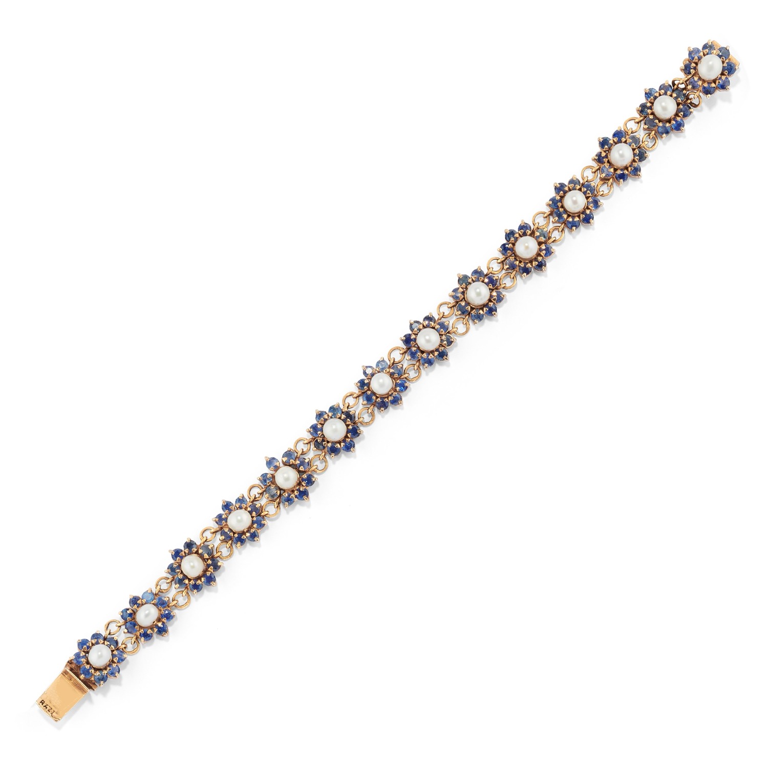 composta da collana e bracciale a motivi floreali con perle e zaffiri taglio rotondo, e orecchini a tre elementi pendenti con chiusura a monachella aperta, difetti (un elemento mancante).
