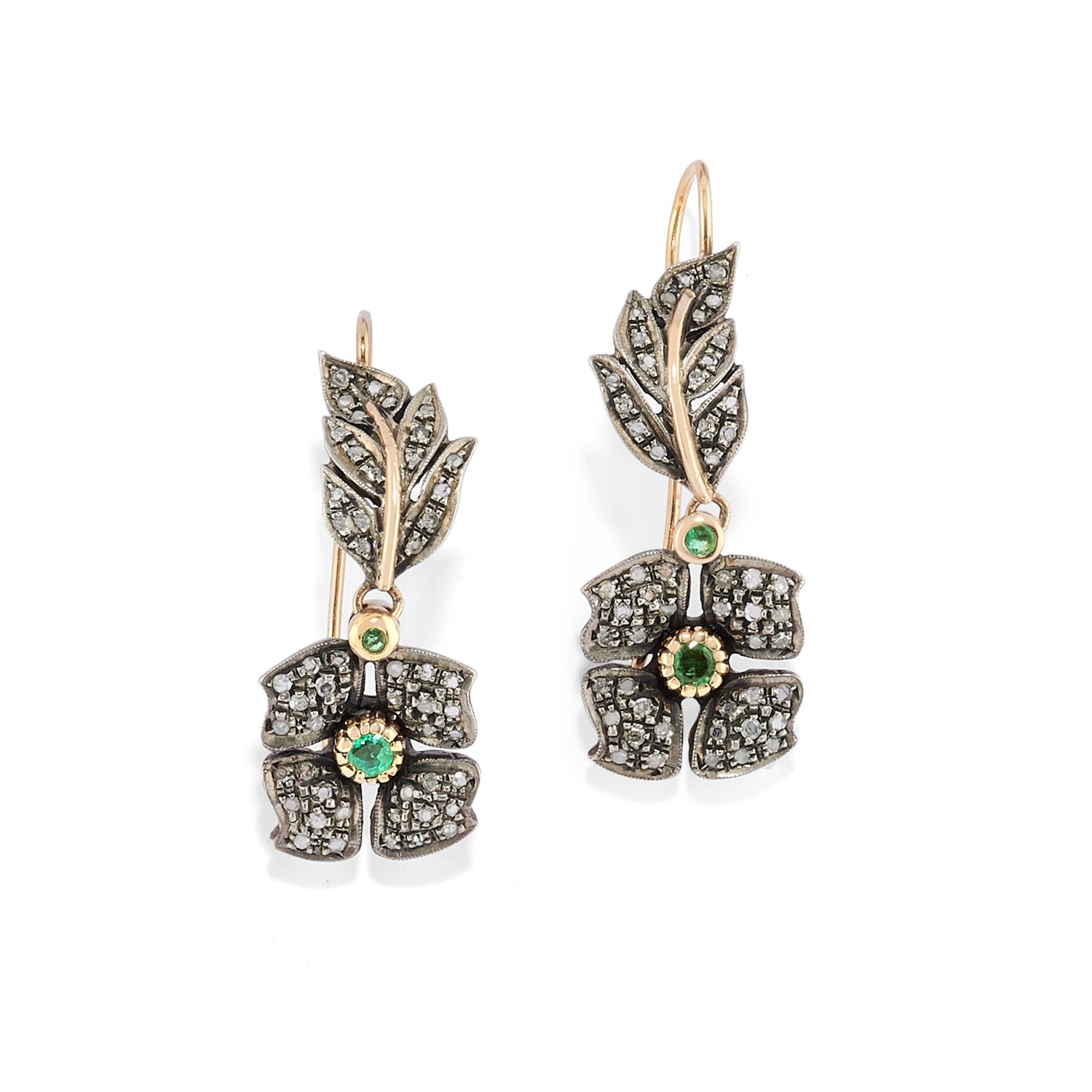 a motivo floreale, decorati con smeraldi e diamanti taglio rosa, chiusura a monachella aperta.