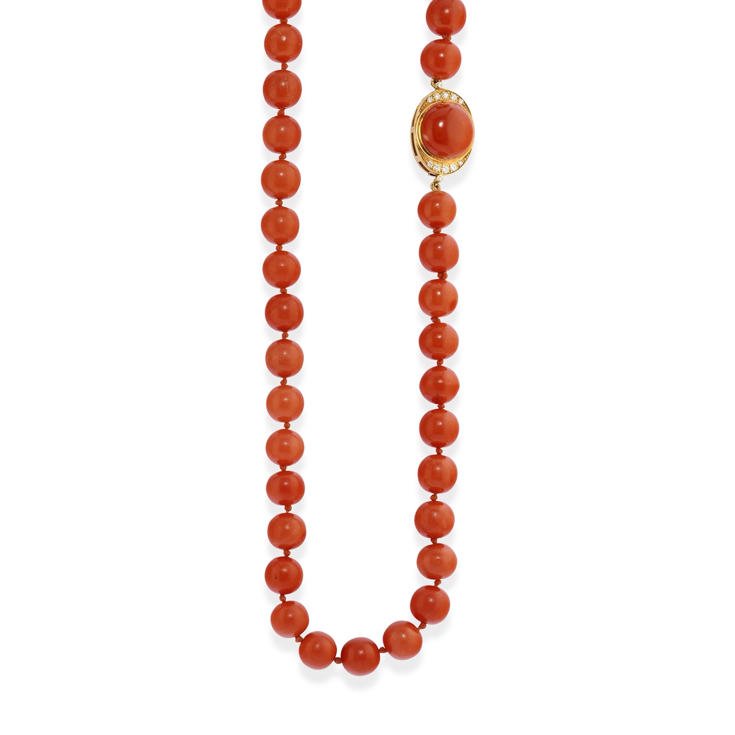 ad un filo di boules in corallo (prob. Sciacca) di mm 10,50/11,50 con chiusura impreziosita da diamanti taglio brillante.