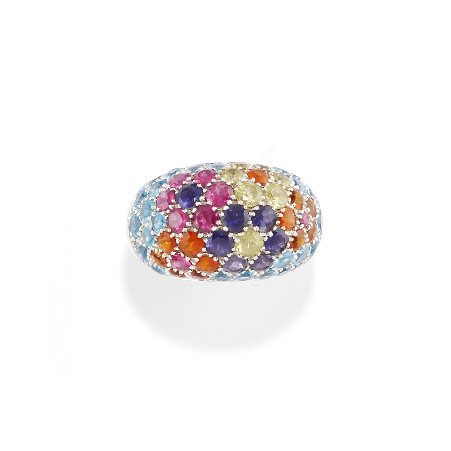 a fascia bombata, decorata con pietre semipreziose di colori diversi taglio rotondo.