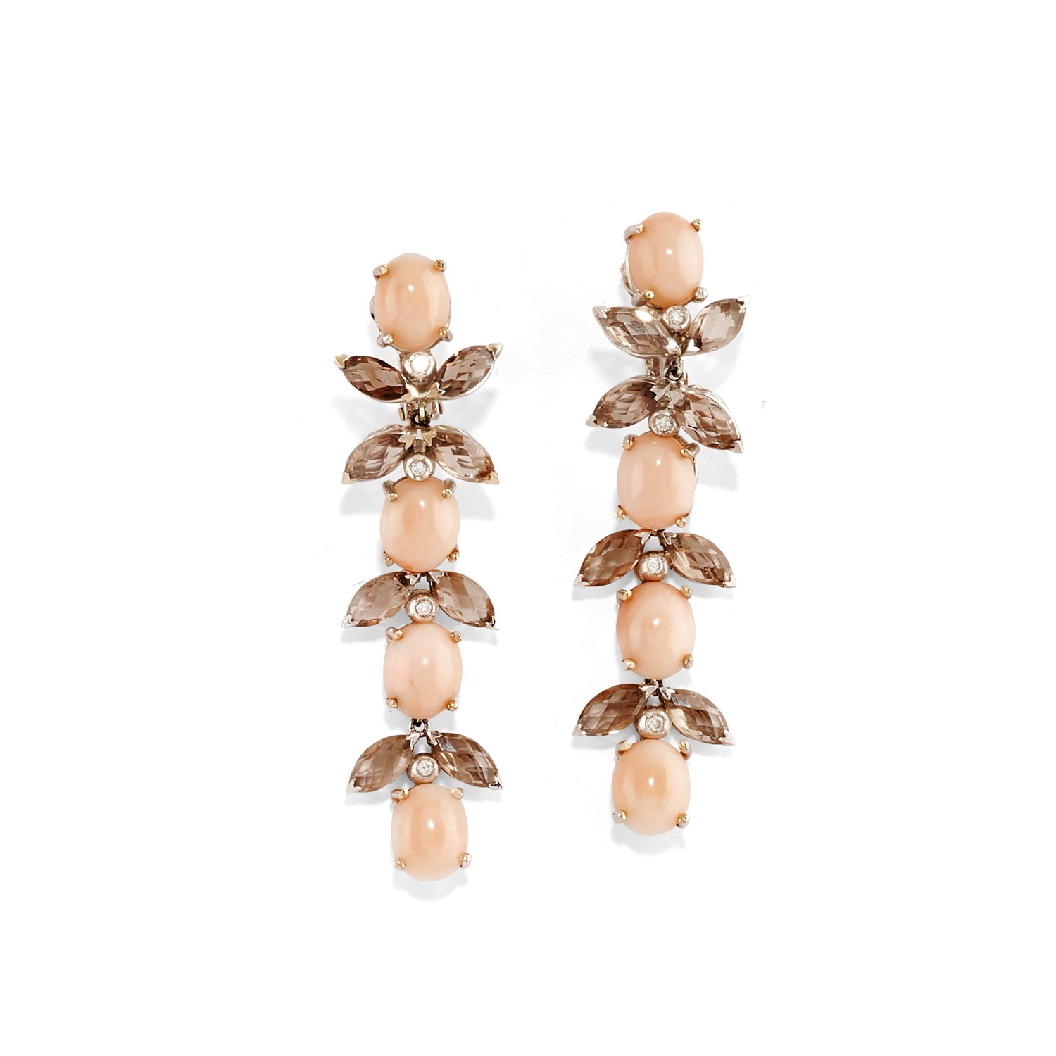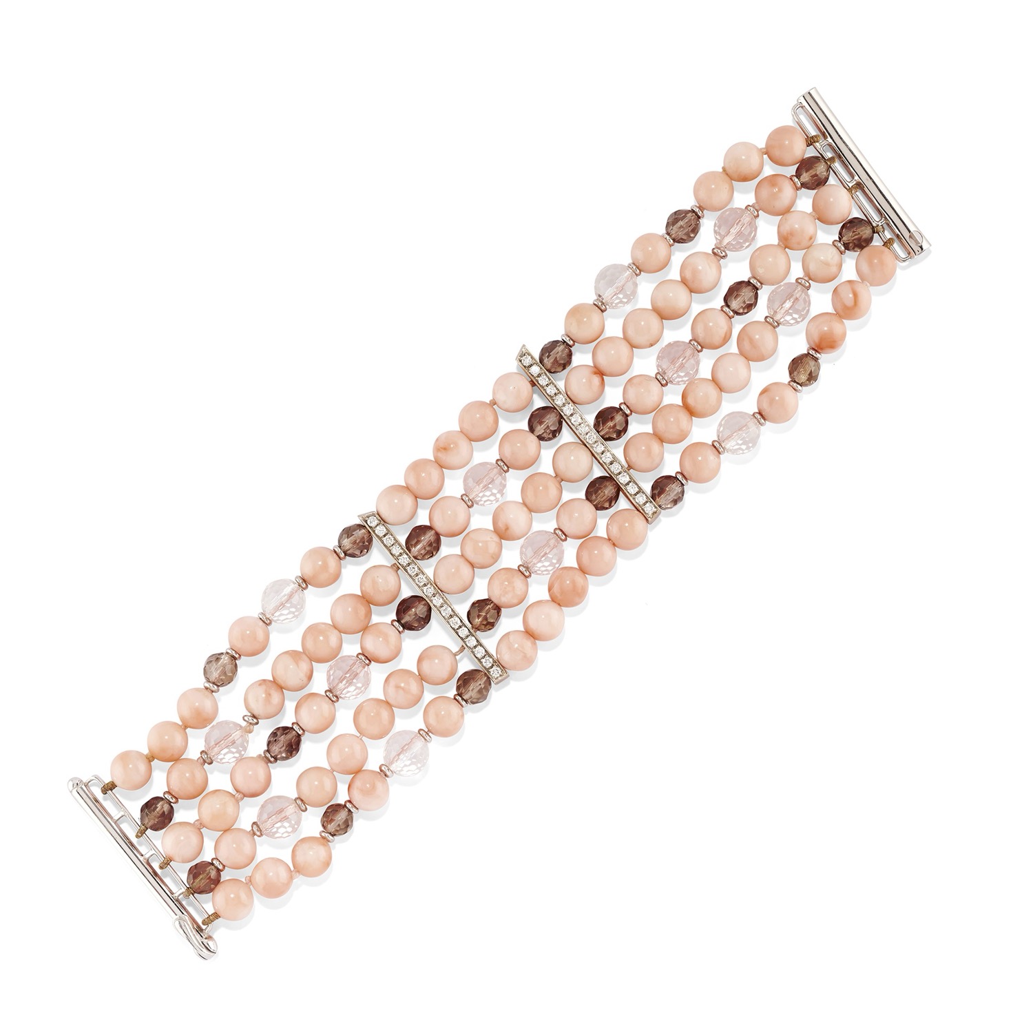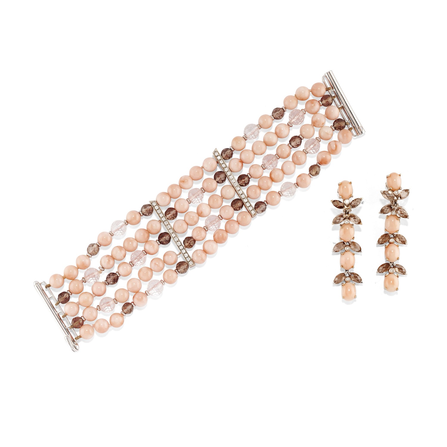 composta da bracciale a fascia con cinque file di boules in corallo rosa di mm 7,00 circa intervallate da boules in quarzo e cristallo di rocca, trattenute da barrette con diamanti taglio brillante, e orecchini pendenti con settori snodati decorati con corallo rosa taglio ovale cabochon, quarzi taglio marquise e diamanti taglio brillante, chiusura con perno e clip.