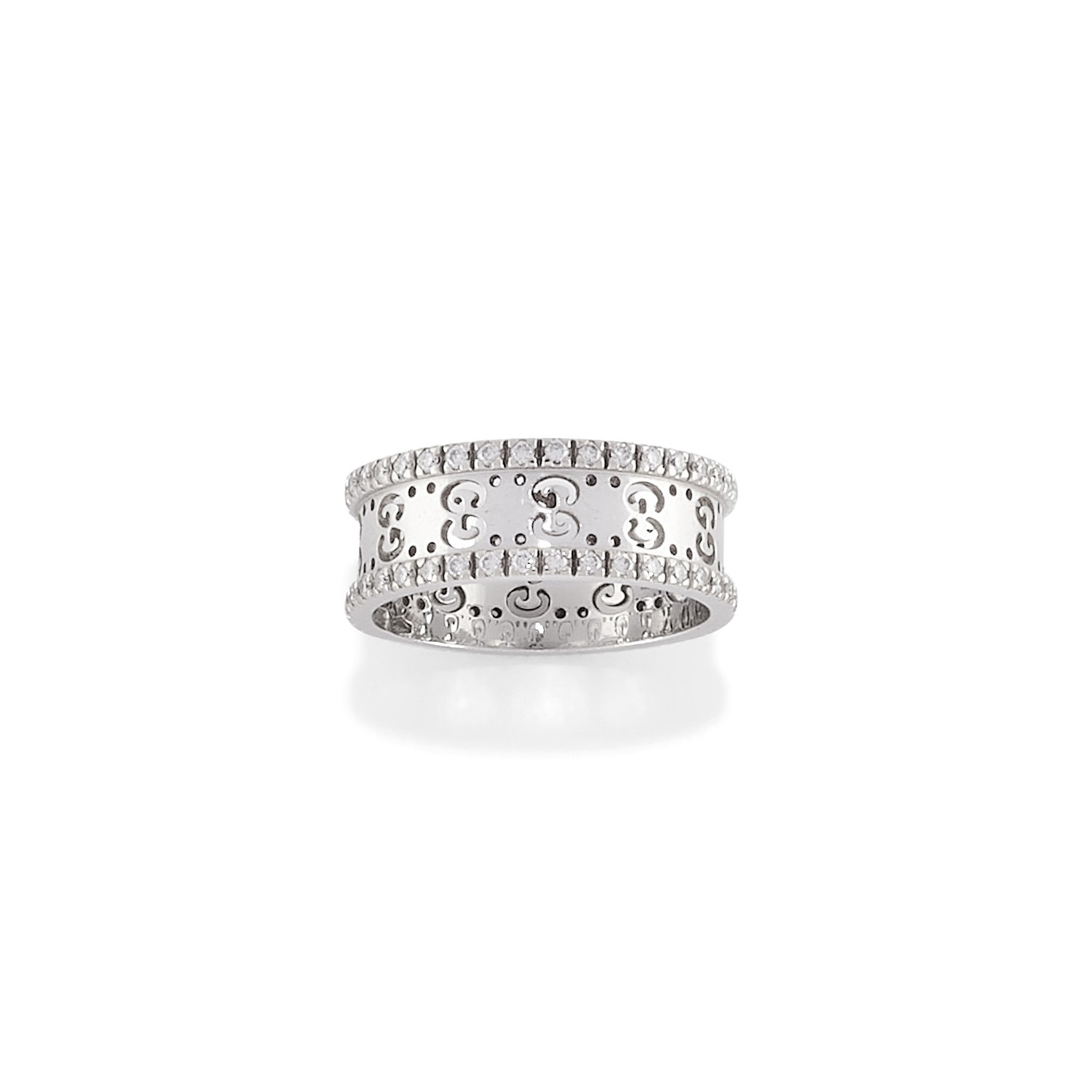 al centro fascia traforata con logo "G", tra due rivière in diamanti taglio brillante a tutto giro.