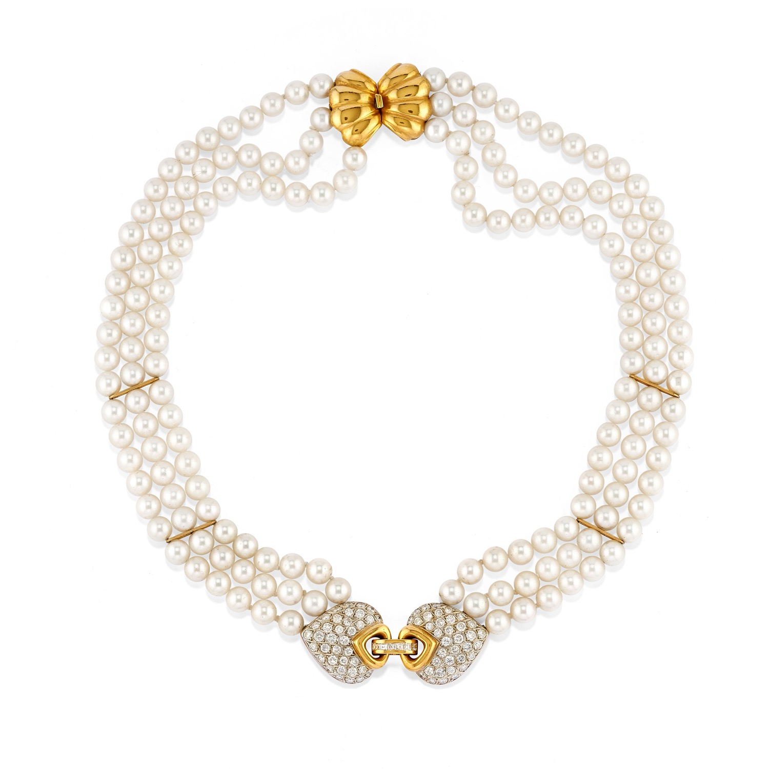 a tre fili di perle coltivate di mm 6,50 circa, motivo centrale a doppio cuore in pavè di diamanti taglio brillante e carrè per totale ct 2,50 circa.