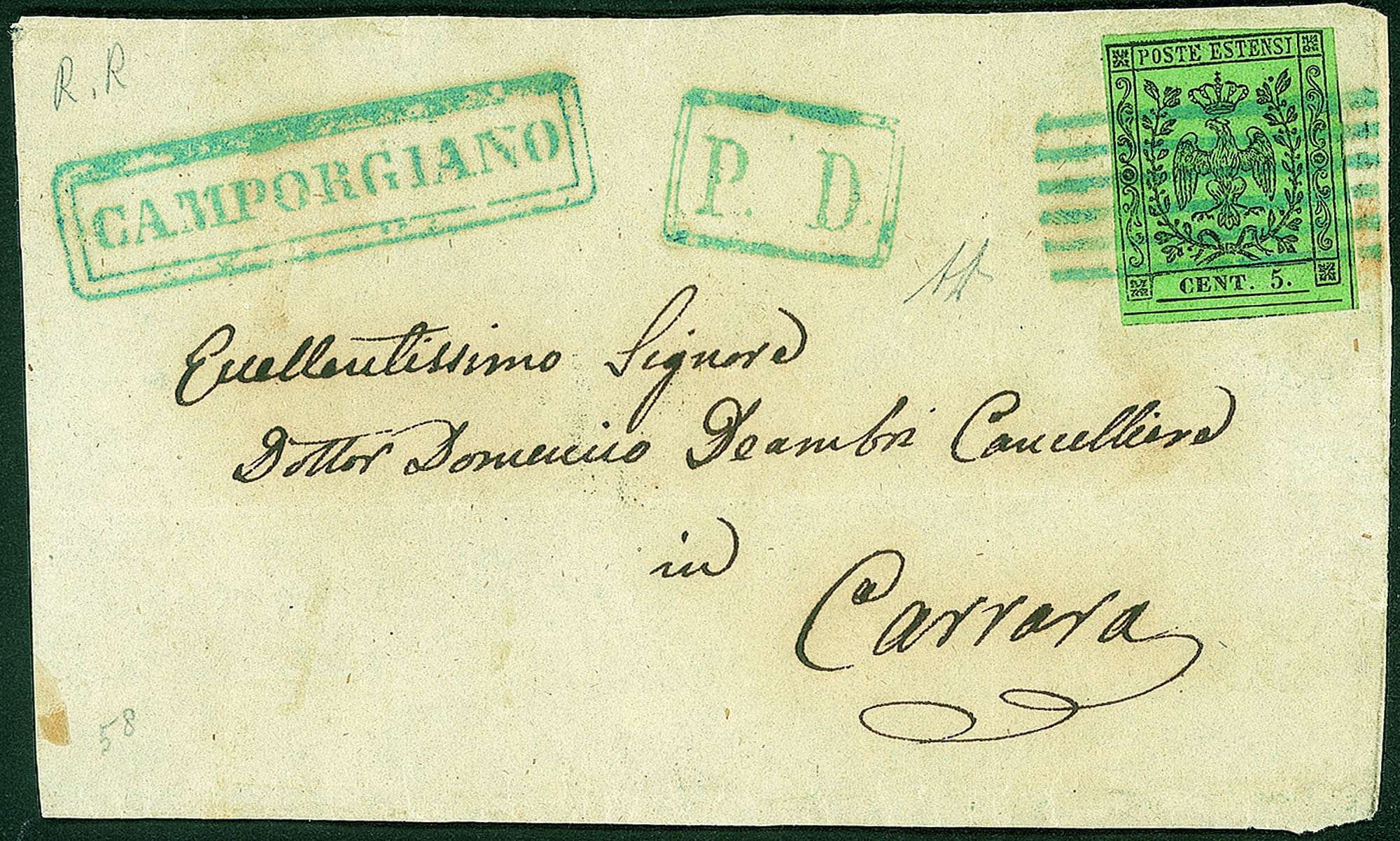 Antichi Stati Italiani - Modena - Frontespizio di lettera spedita da Camporgiano a CarraraCon 5 cent. verde oliva (Sass. 8) annullato col bollo a 5 sbarre azzurro, Camporgiano in cartella azzurro e PD azzurro (non classificato). Raro insieme. Cert. A. Diena del 1966