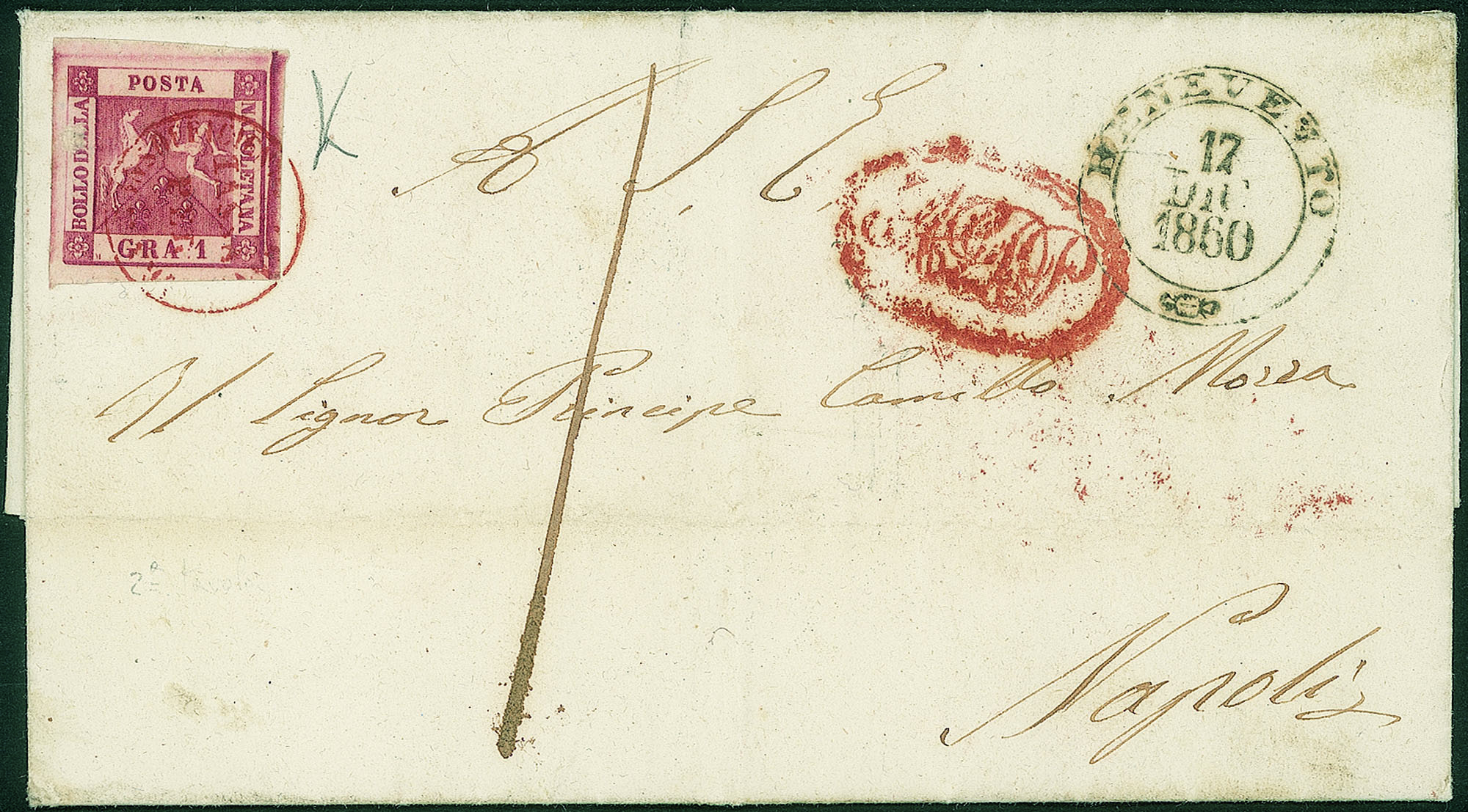 Antichi Stati Italiani - Napoli - Lettera spedita da Benevento per Napoli il 17 dicembre 1860 (assedio di Gaeta)Con 1 gr. Carminio vivo (Sass. 4b) annullato col bollo ROSSO 'Tassa per insufficiente affrancatura' Non catalogato (stima R2) e a lato il bollo doppio cerchio grande di Benevento. UNICA eccezionale. Cert. Bottacchi